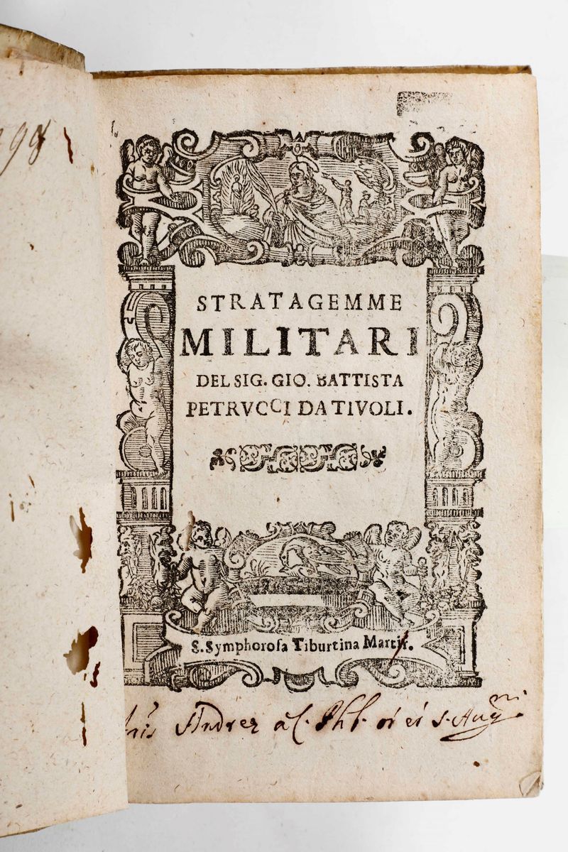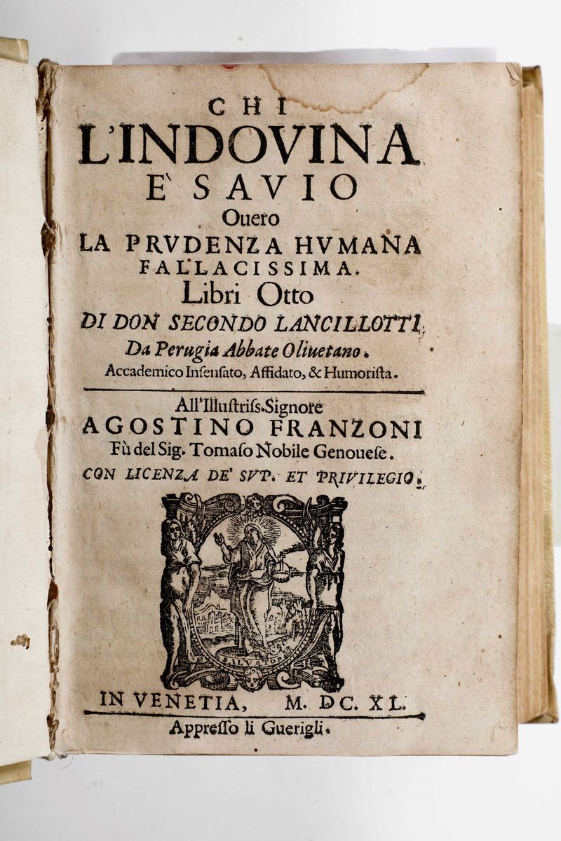 In-16°. Legatra in cartone alla rustica. Con figure xilografiche nel testo. Margini un poco corti. SI AGGIUNGONO NEL LOTTO: Lancillotti, Secondo-Chi l'indovina è savio...Venezia, Guerigli,1640. / Nouveau catechisme des Fracs-Macons...Troisieme edition. A Jerusalem, Pierre Mortier,MCCCCXL? (Antiporta staccata). / Stratagemme militari..Viterbo, Diotallevi,1643. / Trattato de' traffichi giustiet Ordinari...Di Padre M. Thomaso Buoninsegni...Venezia,Angelieri,1591.(Ex libris a timbro al frontespizio).
