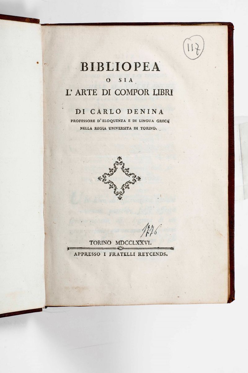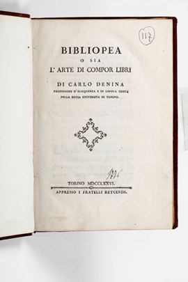 Denina Carlo Bibliopeia, ossia l'arte di compor libri... Torino, appresso i Fratelli Reycends, 1776.