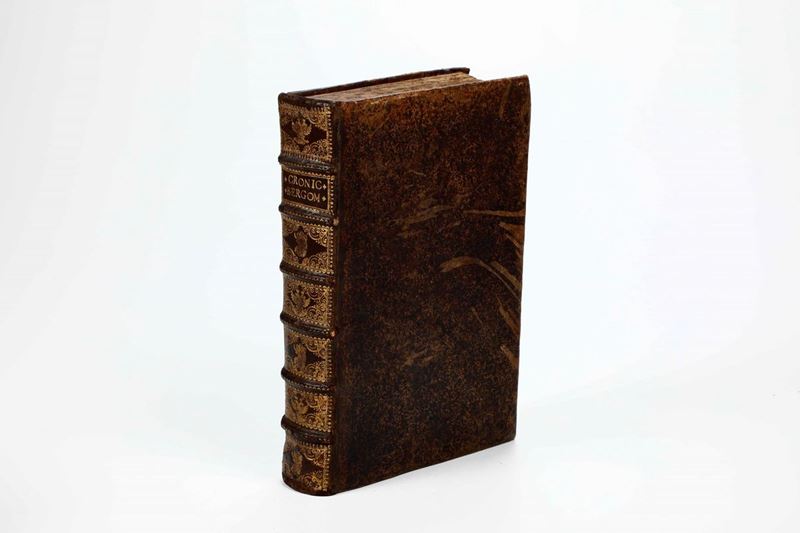 In-folio. Bella legatura antica del XVII secolo in piena pelle con ricchi fregi e titoli in oro al dorso, tagli a spruzzo. Bellissima edizione adorna di 4 grandi legni a piena pagina raffiguranti: la creazione di Eva, la tentazione del pomo, cacciata di Adamo e Eva dal paradiso terrestre, Caino che uccide Abele e la costruzione della torre di Babele. Presenti inoltre nel testo 89 xilografie più piccole rappresentanti vedute di città. Esemplare molto bello e fresco, ad ampi margini.