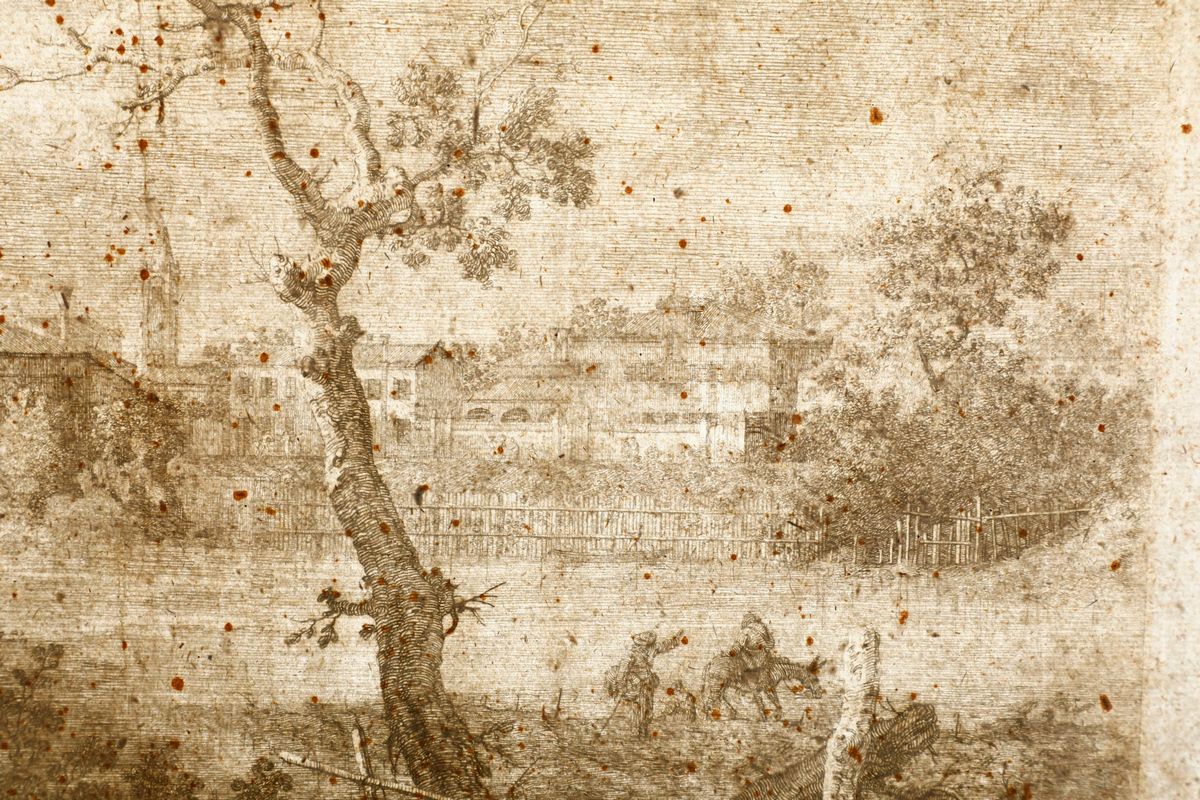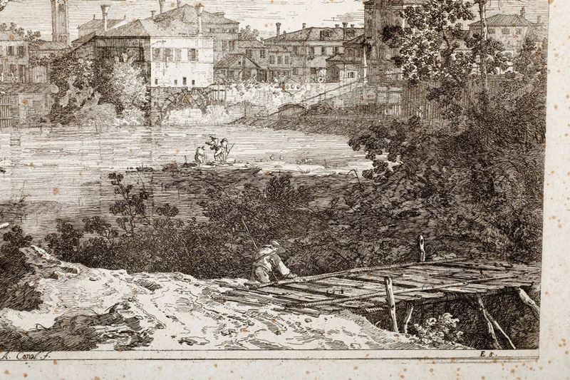Foglio cm 37,5x50,5, rame cm 30x43. Acquaforte firmata sulla lastra al centro. Terzo stato dopo l'aggiunta della sigla E5, in basso a destra. Filigrana R, tiratura dopo il 1778. Fioriture alla carta. Montecuccoli, pg. 243. come è noto, le lastre di Canaletto furono disperse nei primi decenni dell'Ottocento.