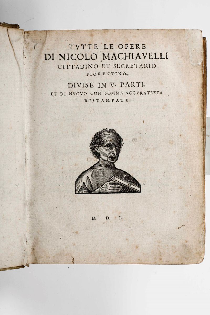In-4°. Legatura in pergamena coeva. Ex libris Leonis S. Olschki. Celebre edizione chiamata La testina nome ricavato dall'effige riprodotto al frontespizio del Machiavelli, in una copia particolare, perchè appartenuta al celebre librario antiquario Leone Olschki di Firenze.