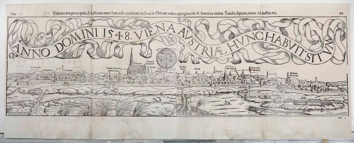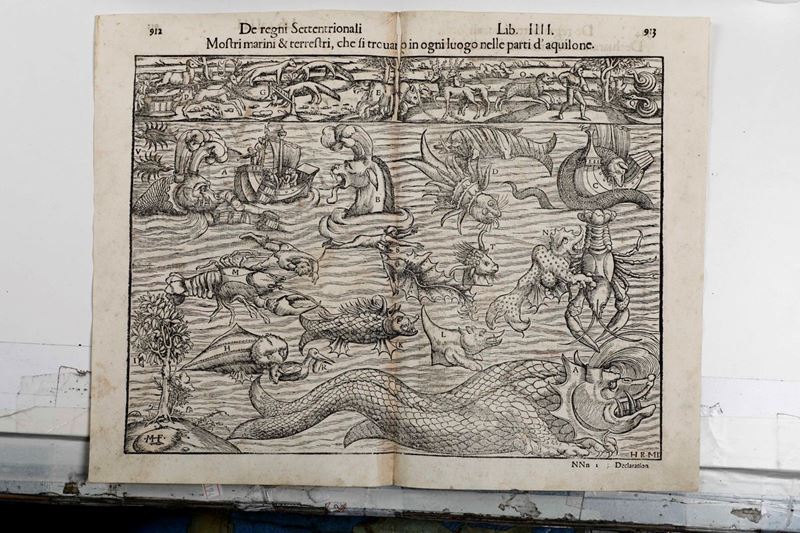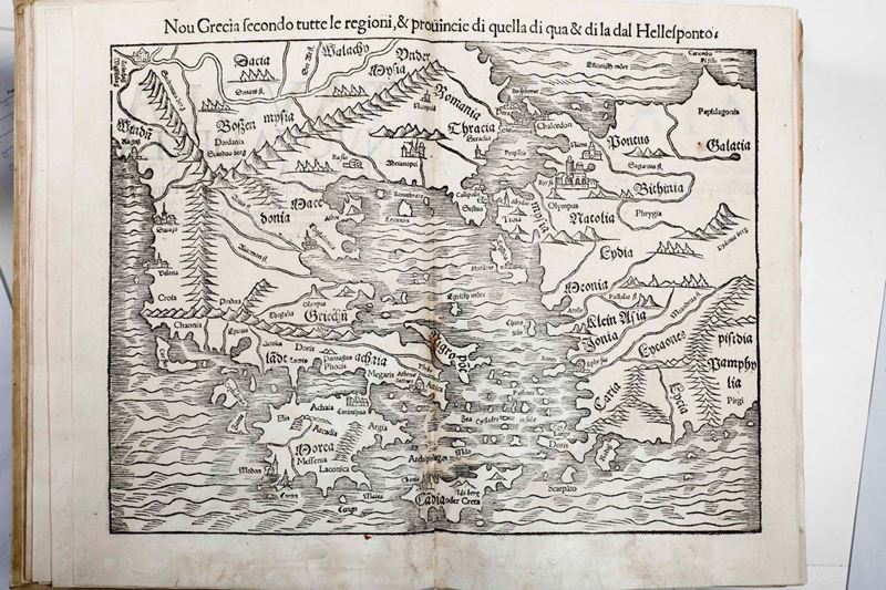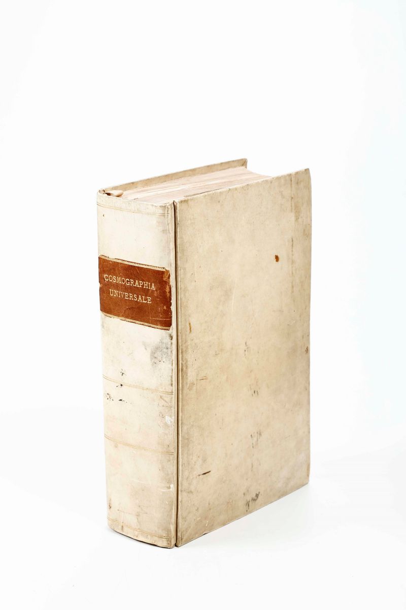 In-folio. Rilegatura in piena pergamena del XIX secolo. Frontespizio restaurato che presenta ex libris manoscritti e un timbro non chiaramente leggibile. La prima xilografia, denominata Figura del mondo universale, è qui presente staccata, proveniente da una edizione coeva ma differente e reca la dicitura Typus Universalis. Esemplare completo delle belle immagini xilografiche e delle carte ripiegate, (alcune della quali sono staccate dalla rilegatura), ma che presenta delle bruniture non uniformi e alcune gore e danni da umidità. Sono presenti ad alcune carte piccoli fori con perdite di alcune lettere. Difetti di numerazione, per altro riscontrabili sulla copia digitalizzata nel censimento Iccu sbn.