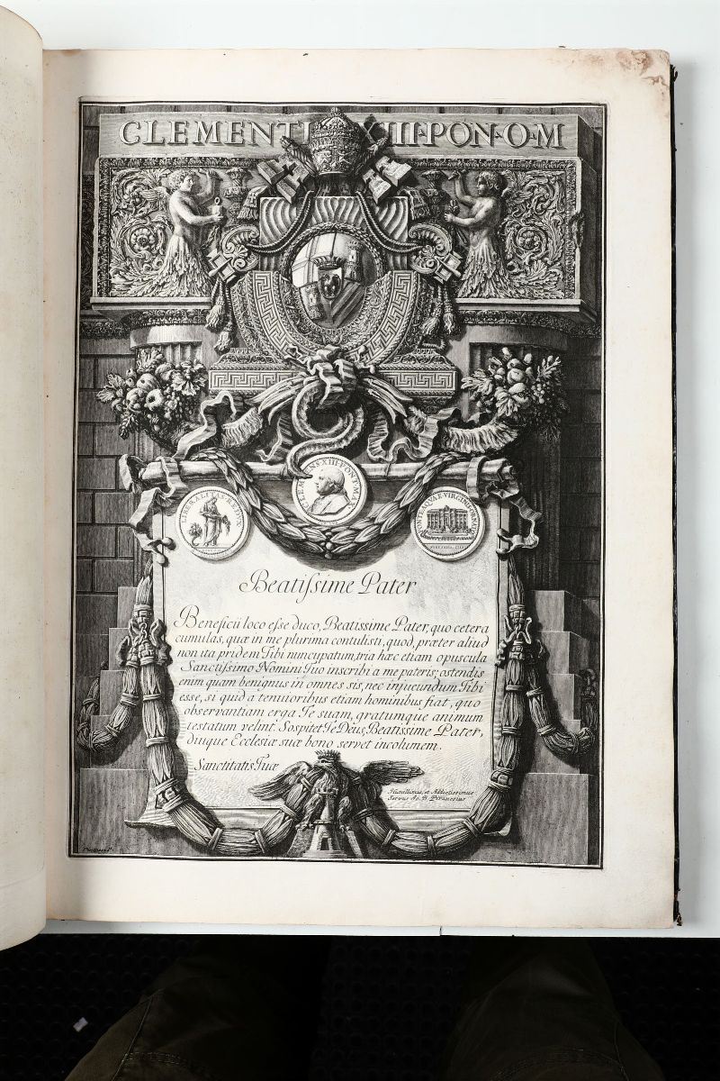 Grande in-folio. Descrizione:Grande tavola incisa più volte ripiegata+Occhietto+Frontespizio inciso+Tavola incisa (dedica a Clemente XIII)+(4)+61+(1) pp. Tracce di polvere. Tracce d'umido e alcuni strappi marginali riparati alle carte di testo. Legatura cartonata del secolo XIX(Cerniera anteriore rotta).