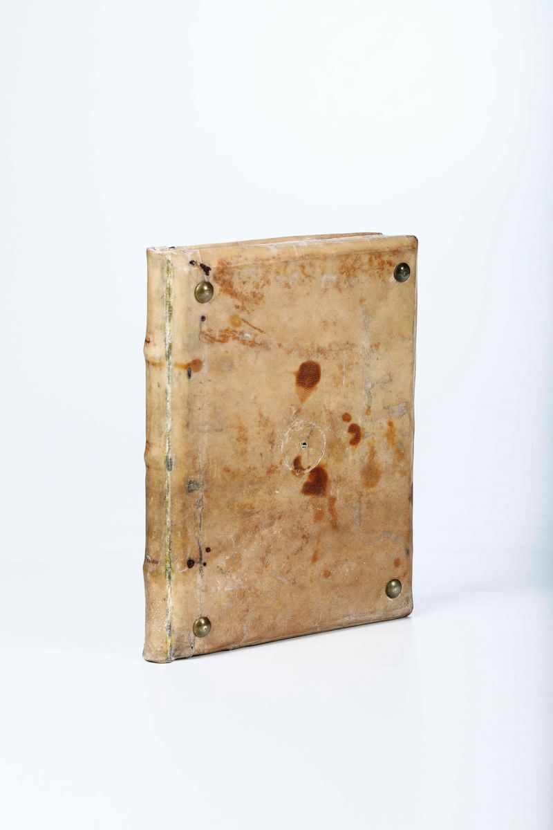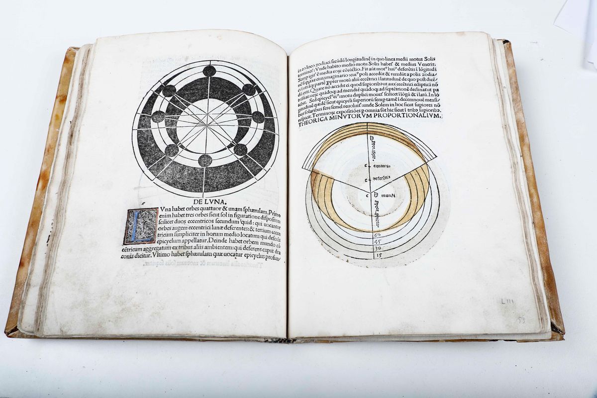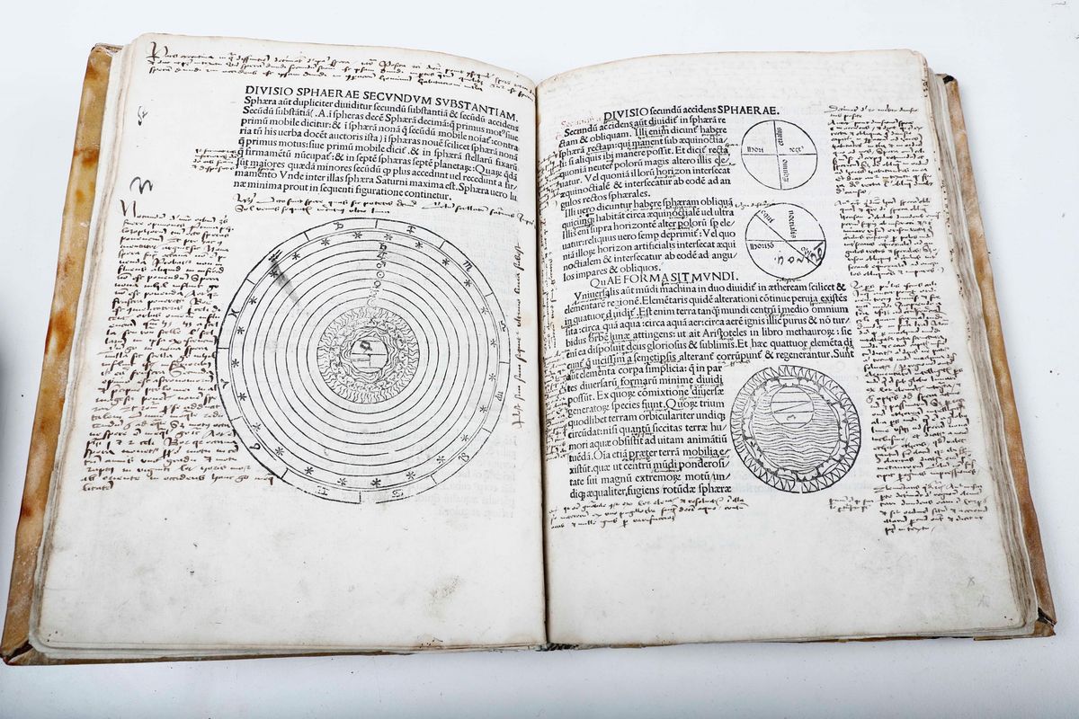 In-4°. Legatura in stile monastico, eseguita riutilizzando materiale antico. 69 carte. Bell'esemplare marginoso, con molte delle xilografie e grafici in bella coloritura antica. Annotazioni marginali di antica mano alle prime 20 carte. Due carte inserite fuori posto, erroneamente dal legatore. Bellissima xilografia a piena pagina al verso della carta A1. Riferimenti: ISTC ij00407000; IGI 5345; Essling 260; Sander 6663. - Titolo tratto da c. A2r: la riga 1. è stampata in nero, le righe 2-8 in rosso. - Colophon composto in forma di carme. - Marca (K280) nel colophon. - A c. A1r illustrazione xilografica a piena pagina con Astronomia, Urania e Tolomeo. - Iniziali xilografiche. - Alcune illustrazioni colorate.
