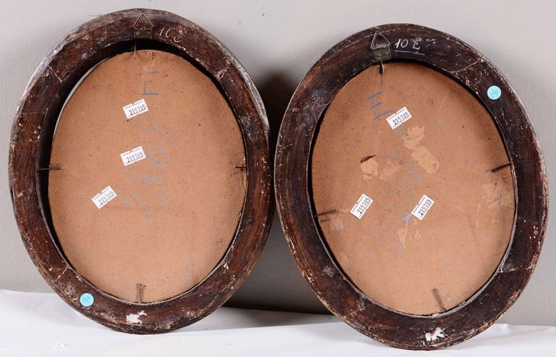 coppia di dipinti a olio su cartone ovale, cm 23x18