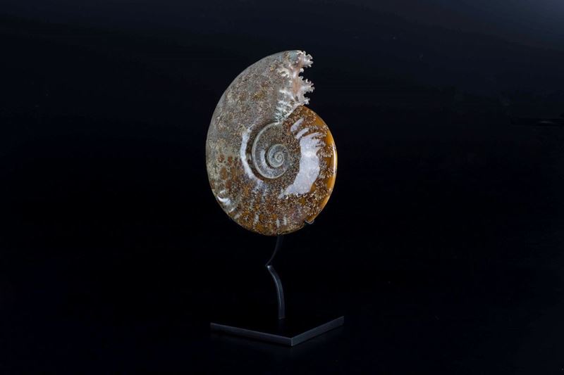 esemplare di ammonite Cleoniceras con eccezionale fossilizzazione e mineralizzazione, su base in metallo Cm 22,5x19x5