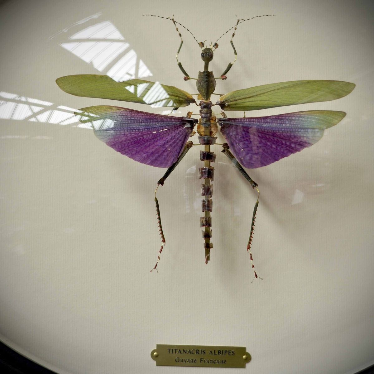preparazione anatomica di Titanacris albipes, in cornice di legno e vetro convesso cm 53x39x14