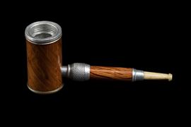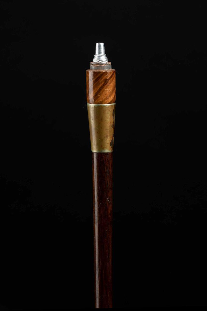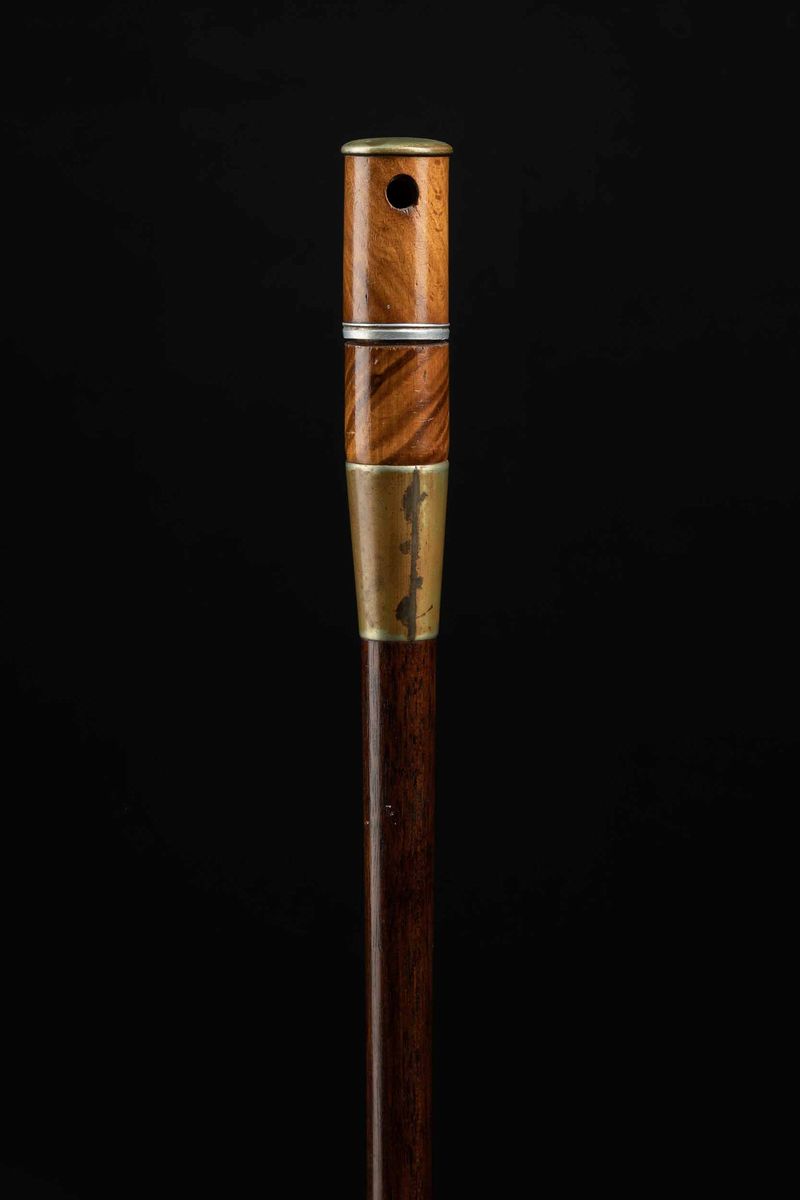 Impugnatura in legno e metallo, che svitandosi crea una pipa. Canna in legno scuro, puntale in corno.