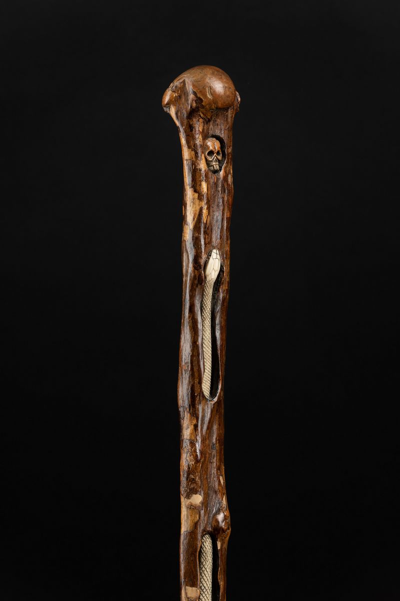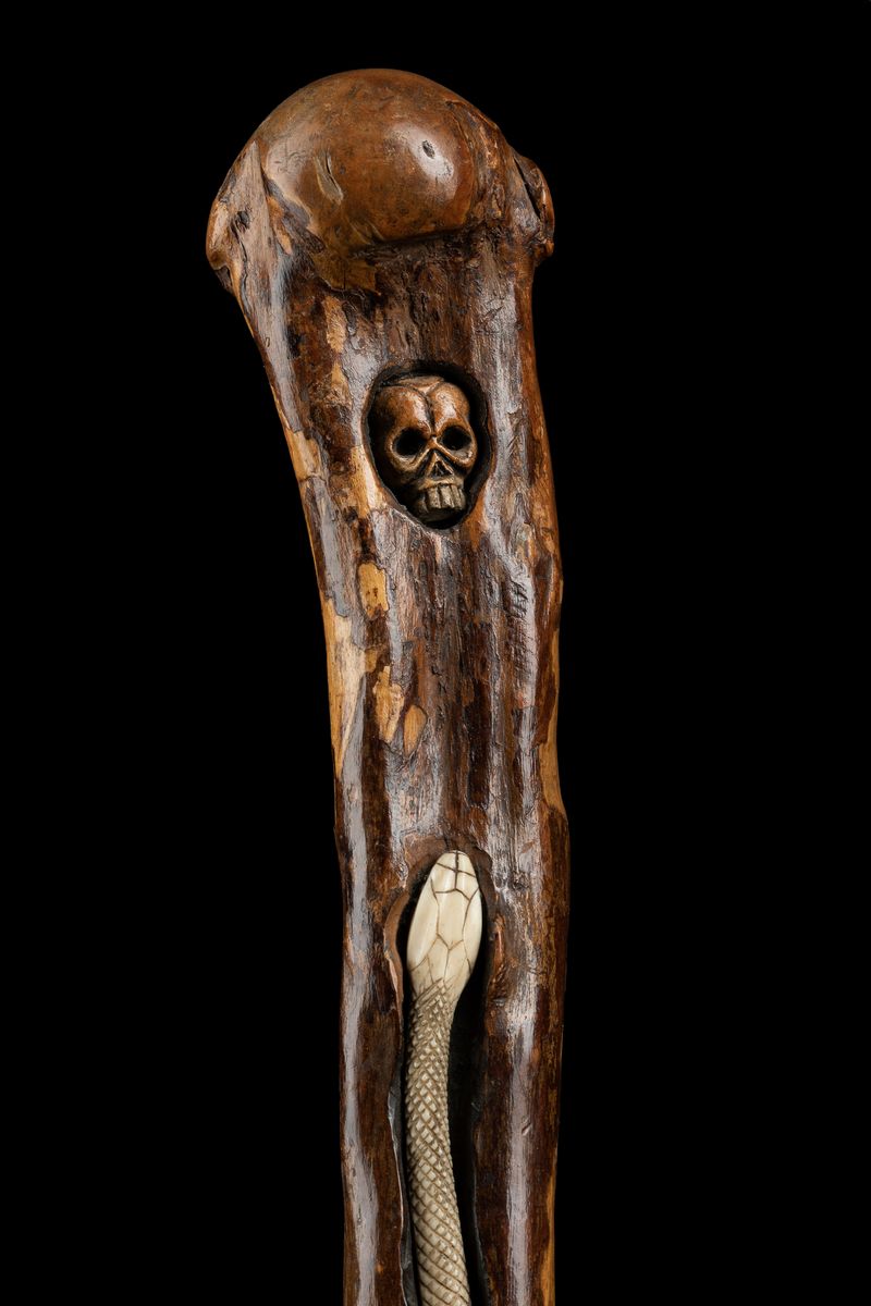 Bastone monossilo in legno al cui interno si sviluppa un serpente in avorio rivolto verso un teschio.