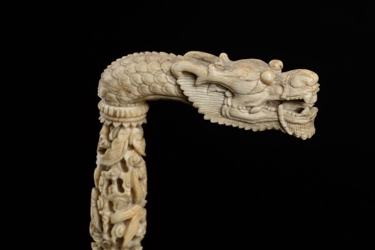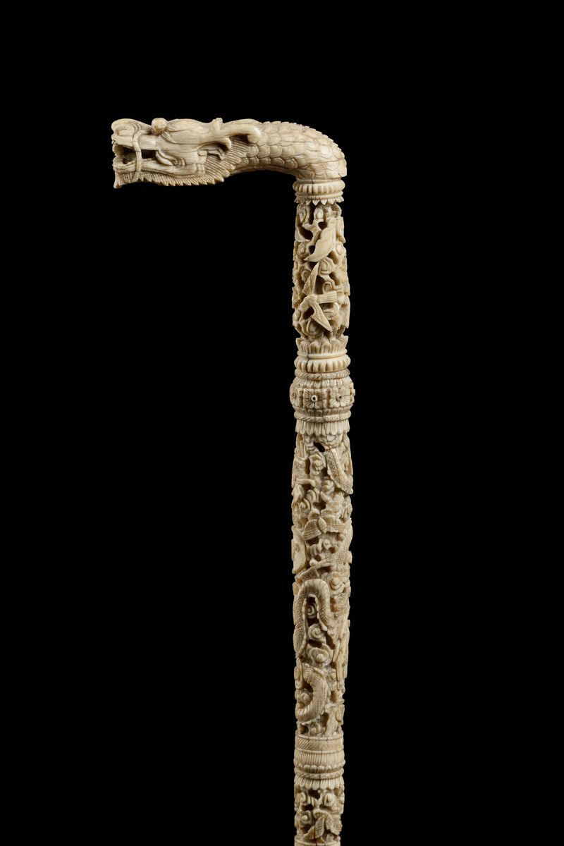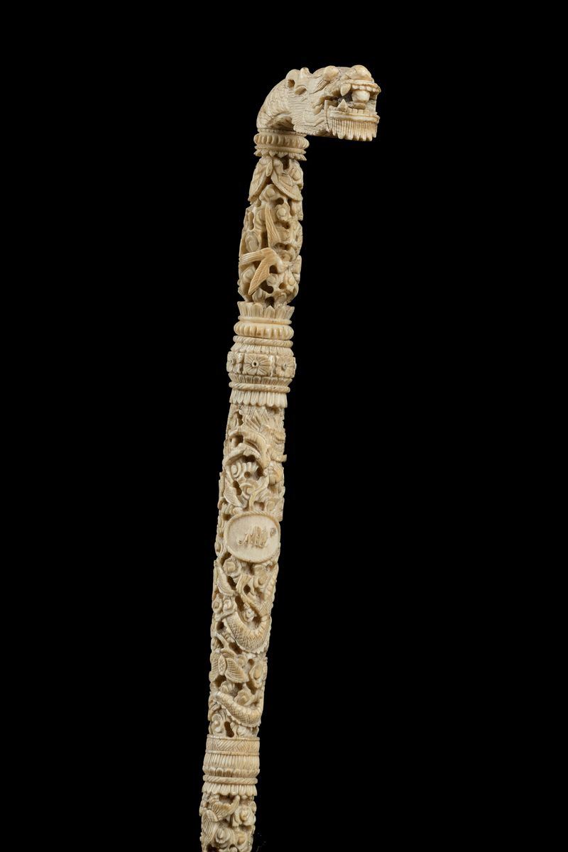 Impugnatura ad L scolpita con testa di drago. Asta a segmenti finemente intagliati con motivi animali e vegetali, monogramma occidentale.