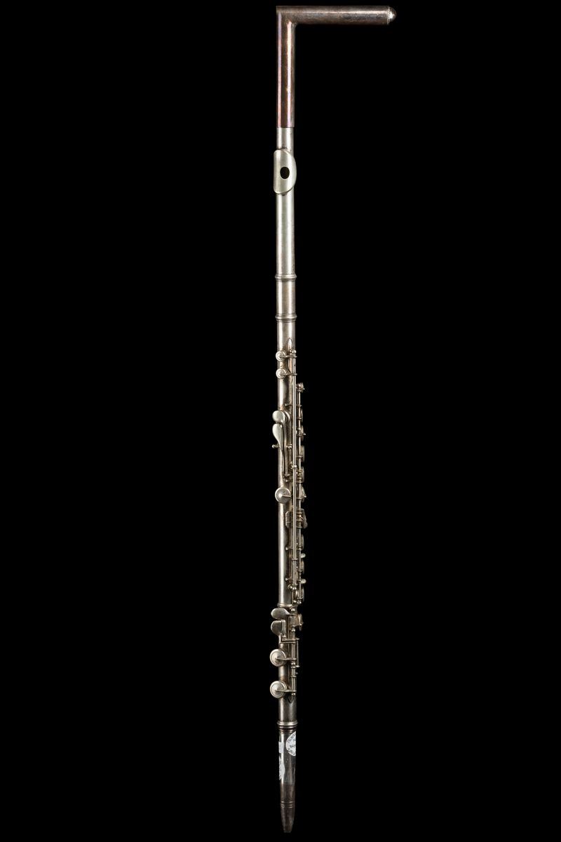 Flauto in metallo con il nome della manifattura francese: Thbouville Fréres. Brevetto 929 Evry La Battaille.