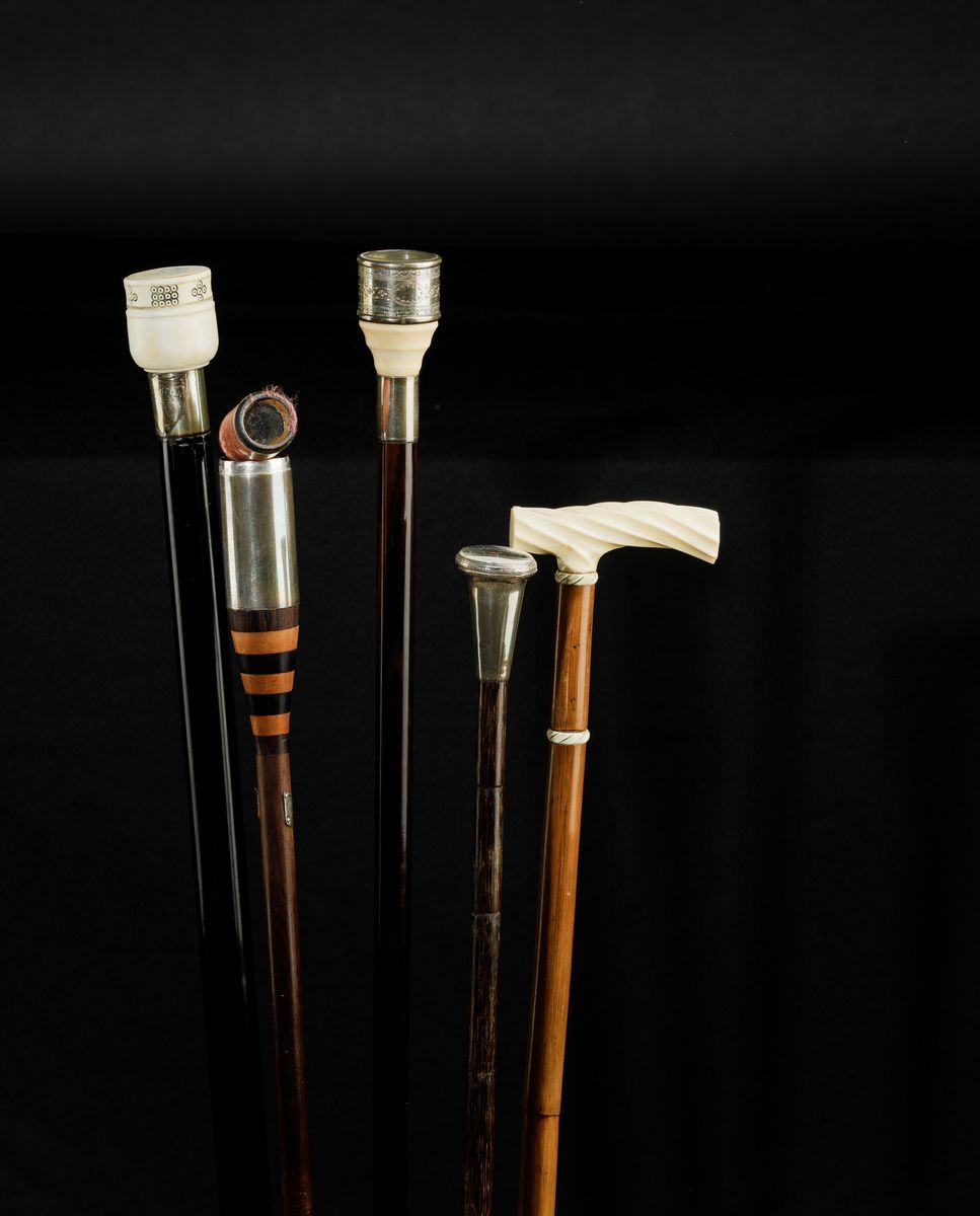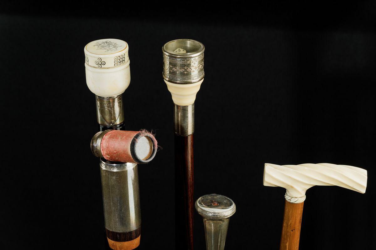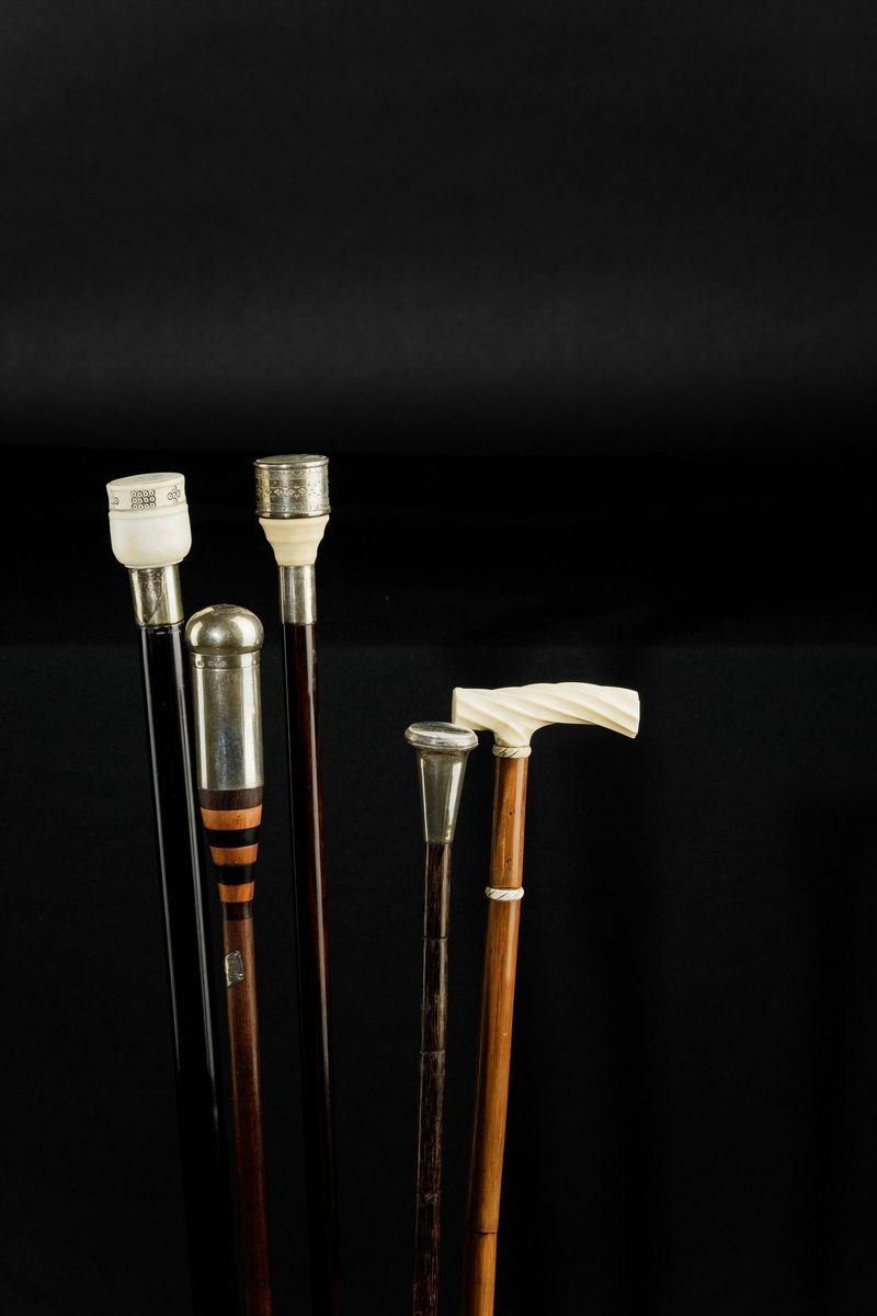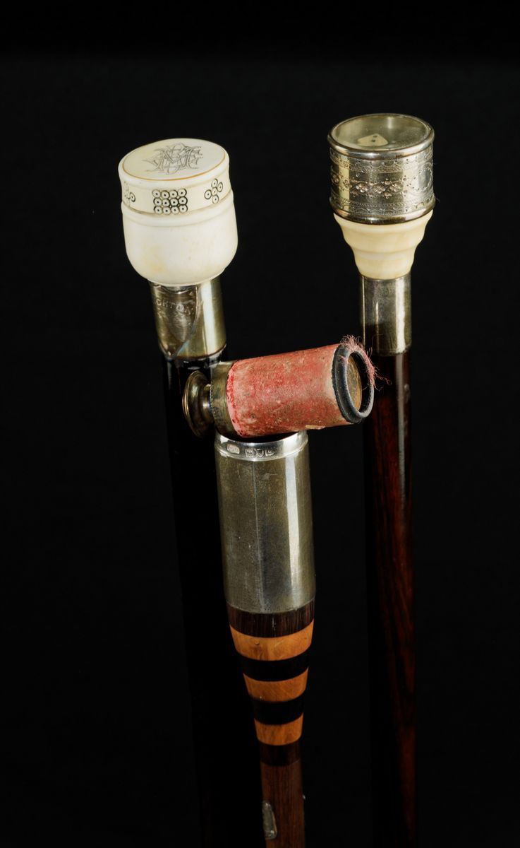 Canne in legno e pomi in avorio e argento, con cannocchiale, strumento sartoriale, dadi da gioco, bilancina in ottone e orologio