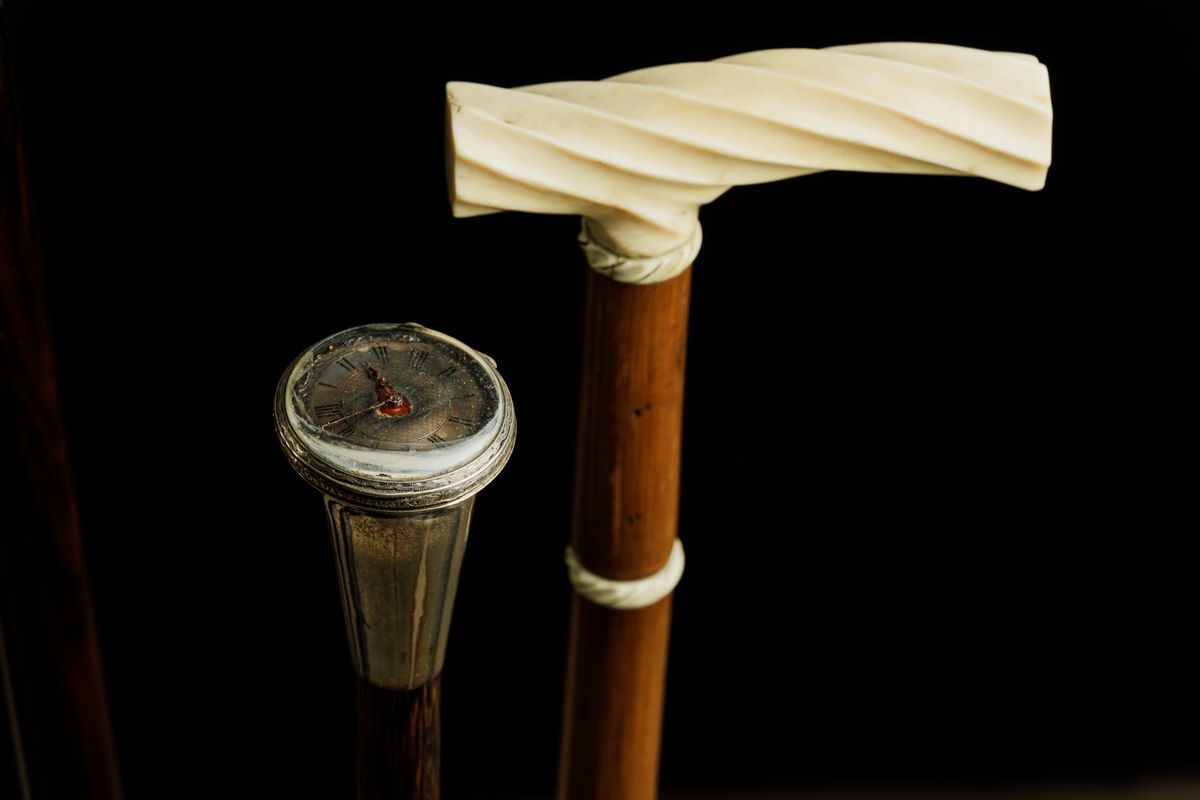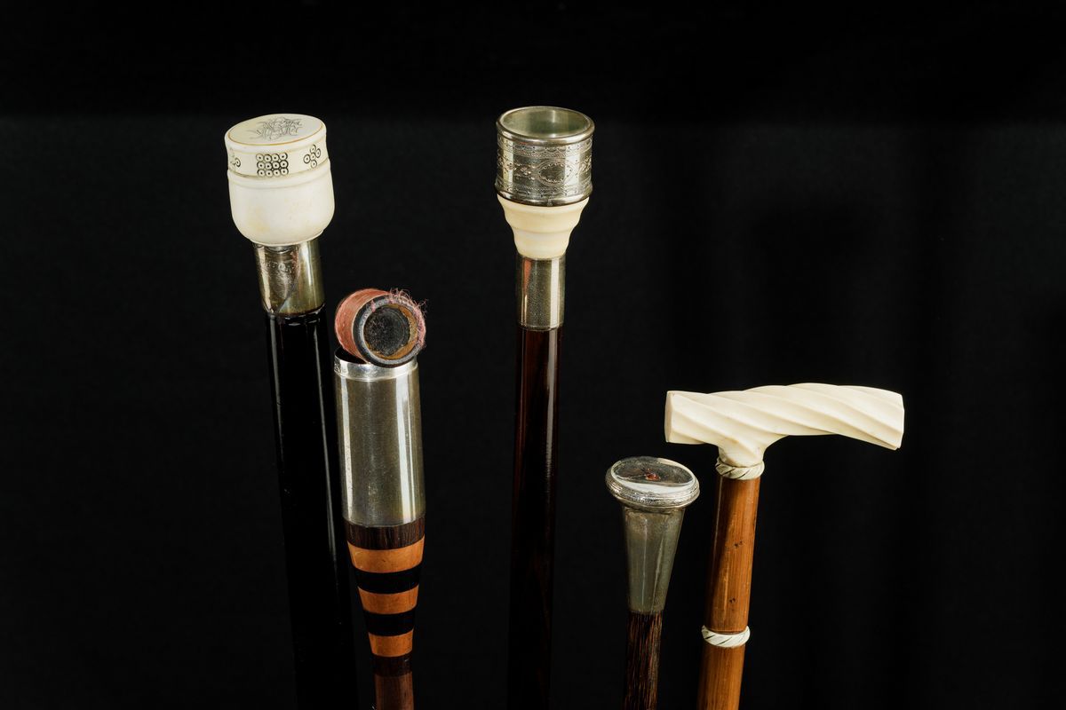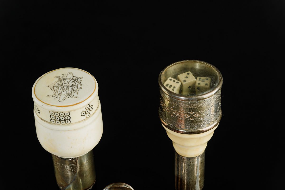 Canne in legno e pomi in avorio e argento, con cannocchiale, strumento sartoriale, dadi da gioco, bilancina in ottone e orologio