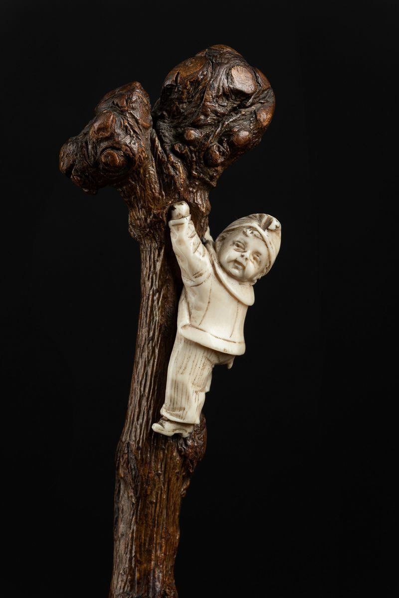 - Impugnatura in biancospino con un bambino in avorio intagliato. Asta in biancospino, collarino in avorio.