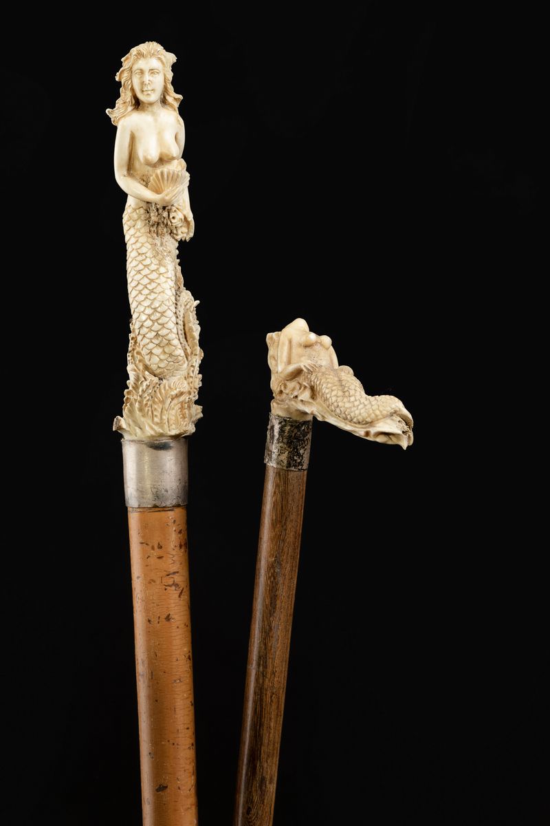 - Impugnatura raffigurante una sirena sdraiata. Collare in metallo. Asta in legno. Puntale in corno.