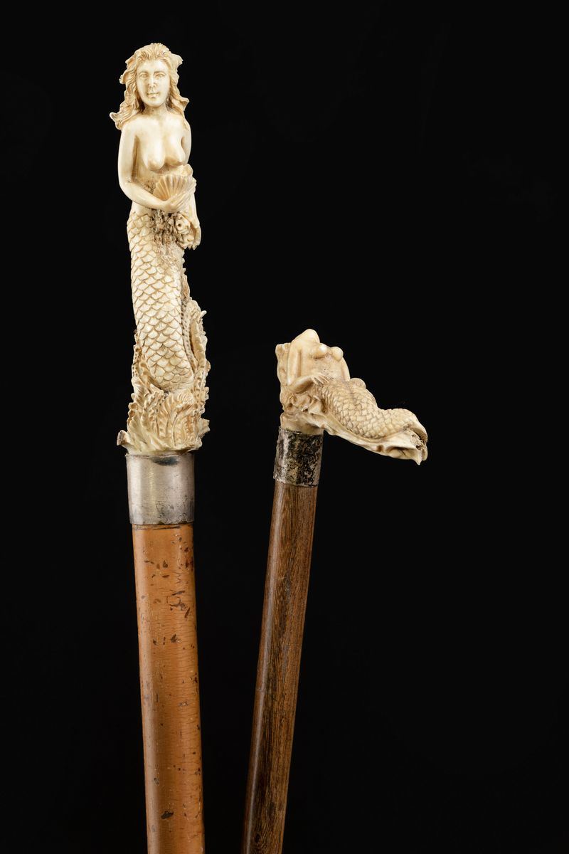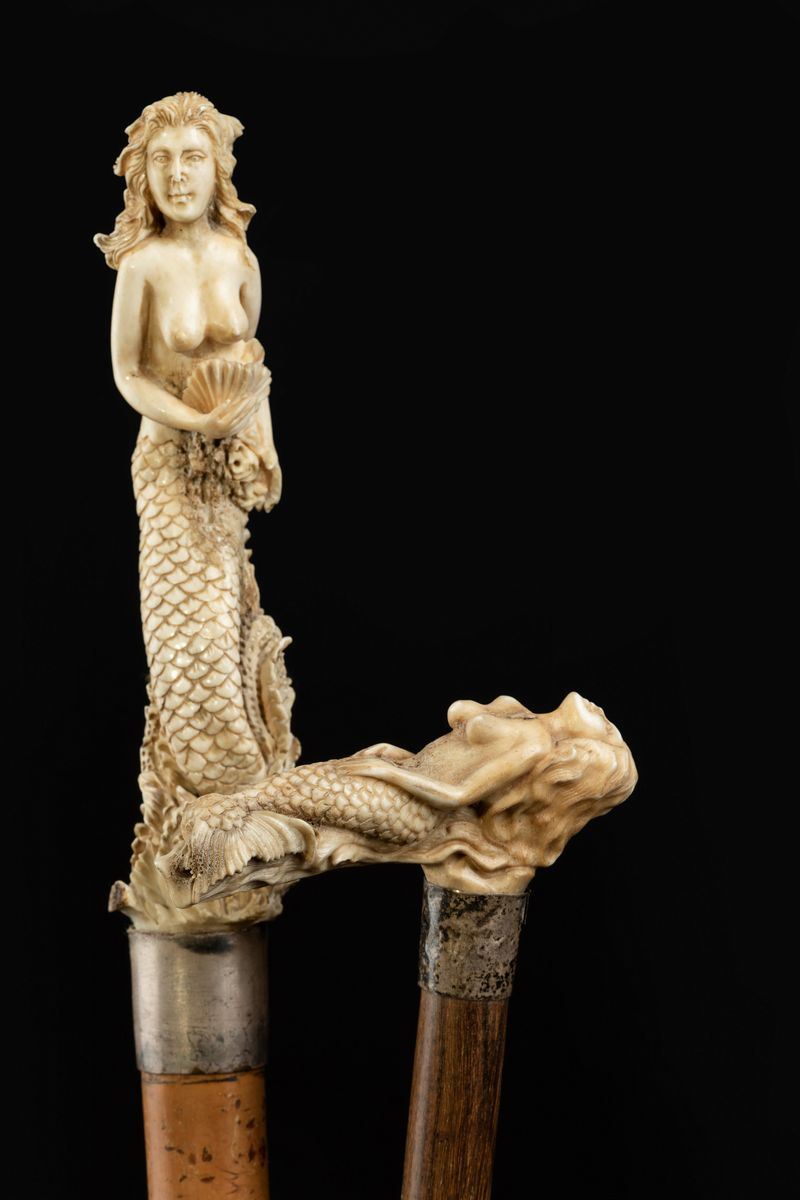 - Impugnatura raffigurante una sirena in posizione verticale. Collare in metallo. Asta di malacca. Puntale in metallo.