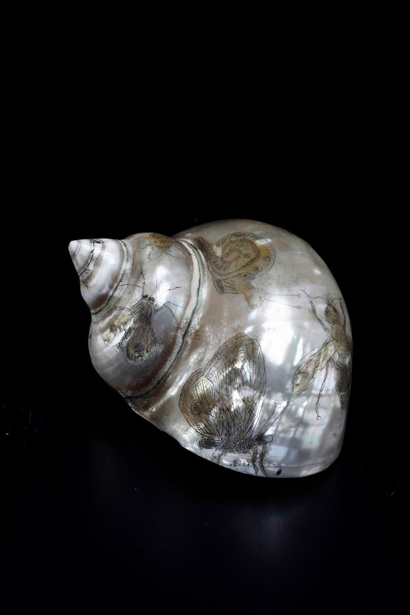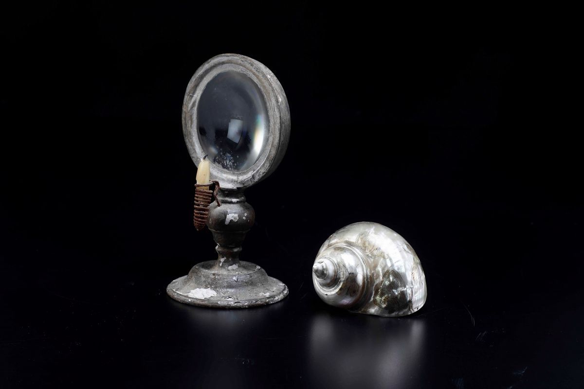 Conchiglia Turbo e lente con lume, su base in legno tornito e laccato.