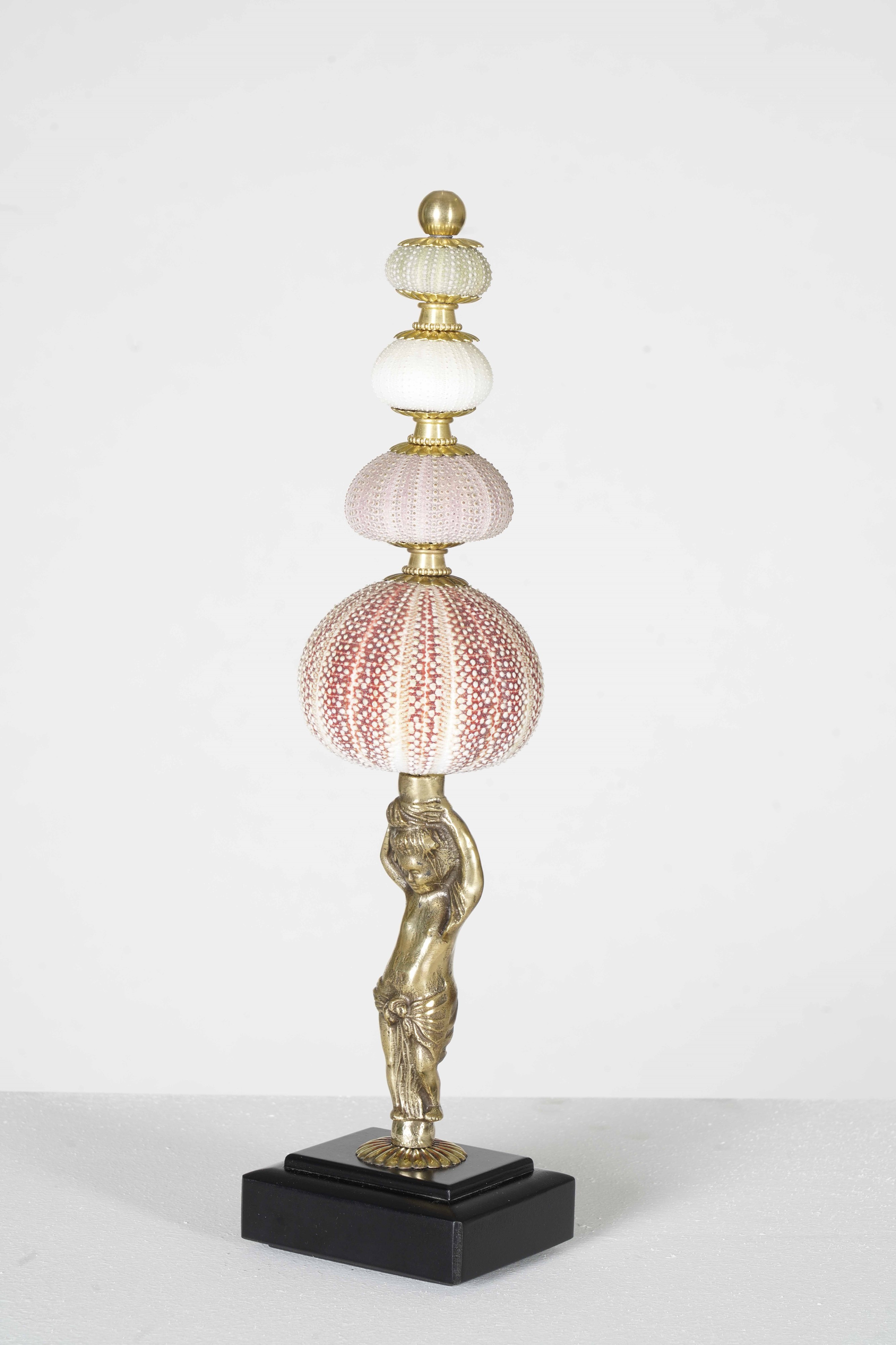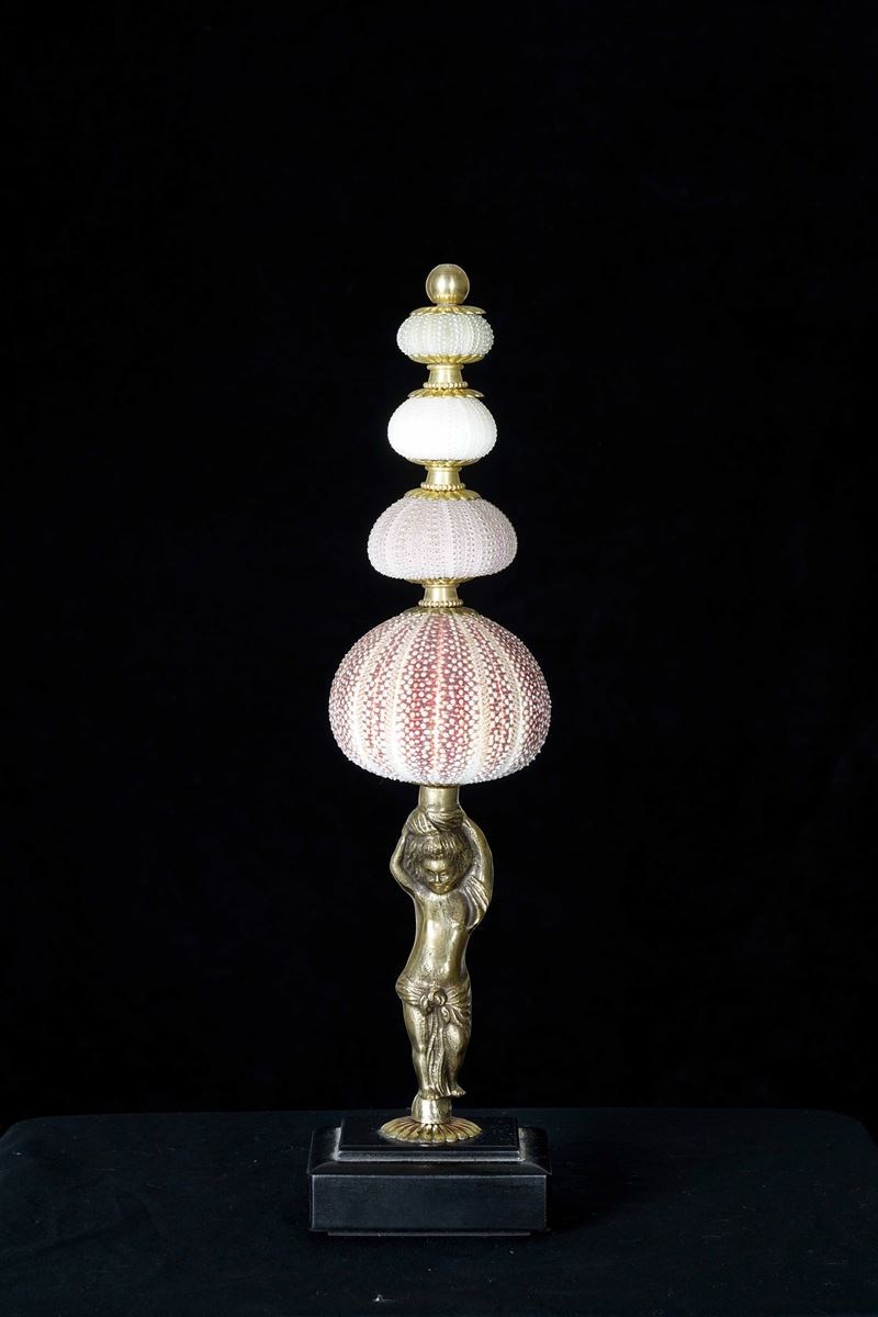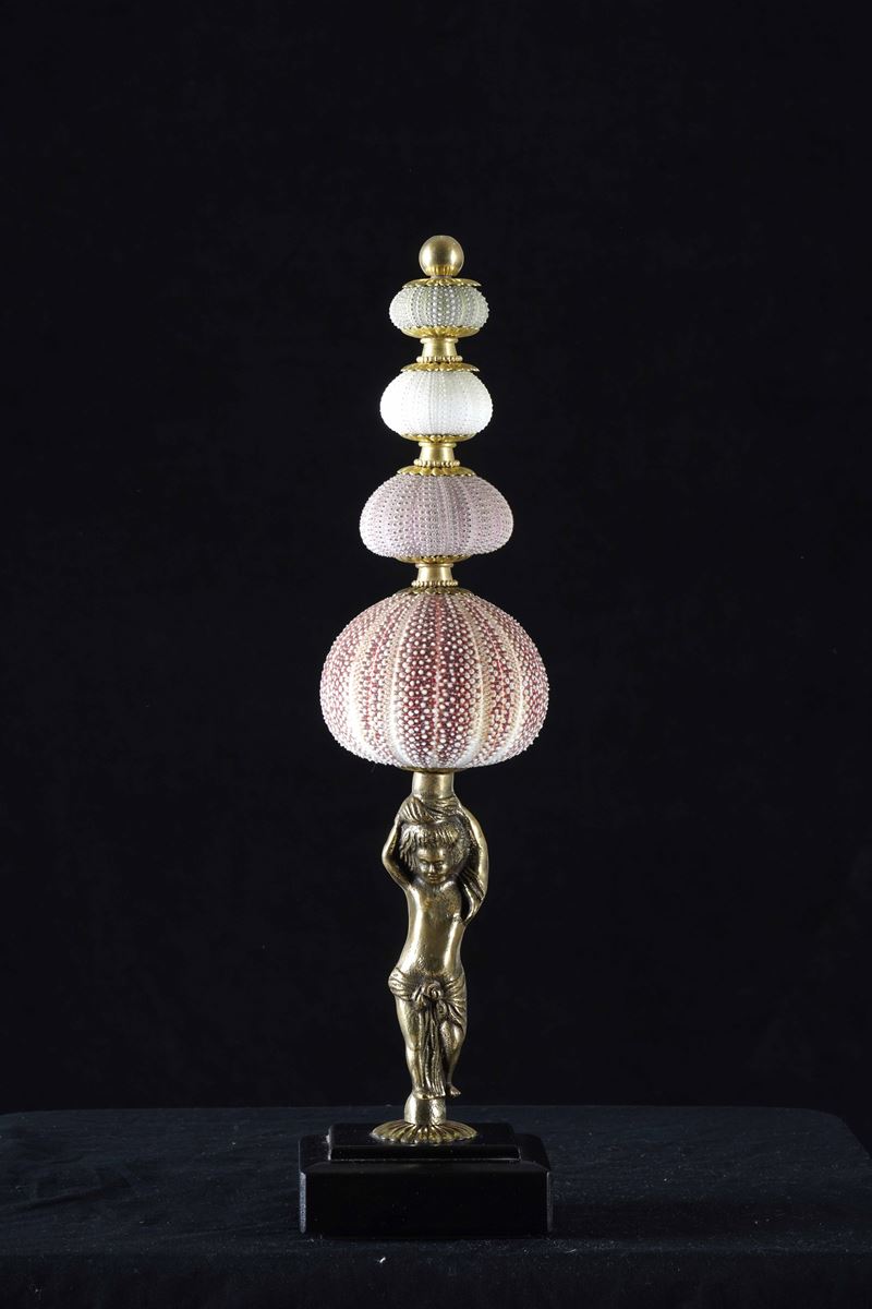 Piccola scultura in ottone sormontata da ricci di mare