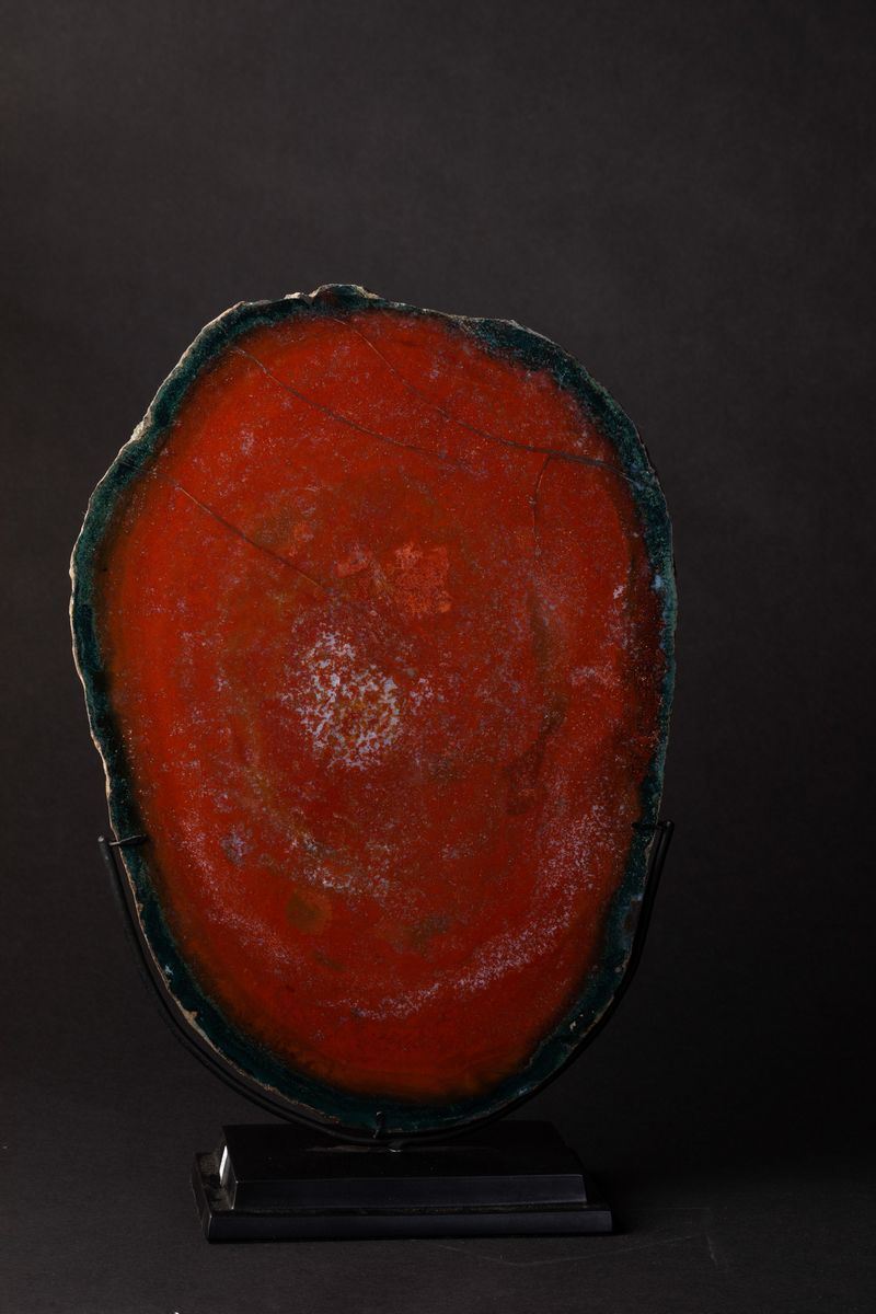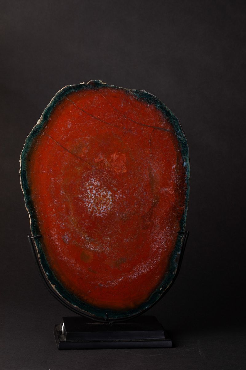 Fetta di diaspro rosso con bordo verde da giacimenti altamente carichi di ossido di ferro.