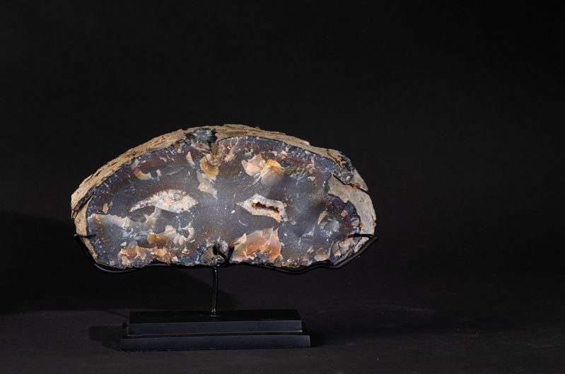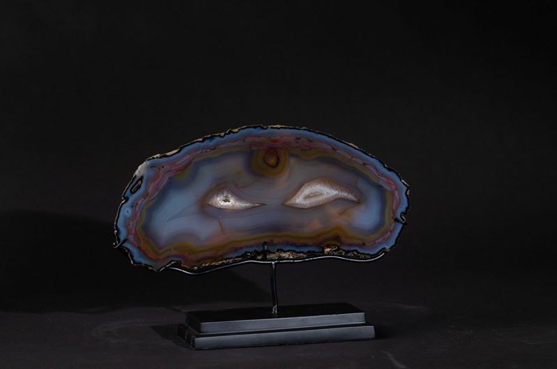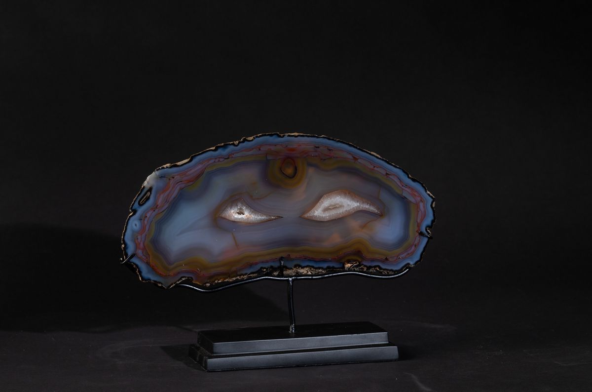 Una fetta di agata brasiliana che presenta colori bluastri iridescenti rivestiti di ematite rossa con un doppio cuore di cristallo