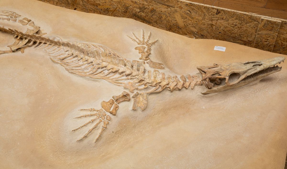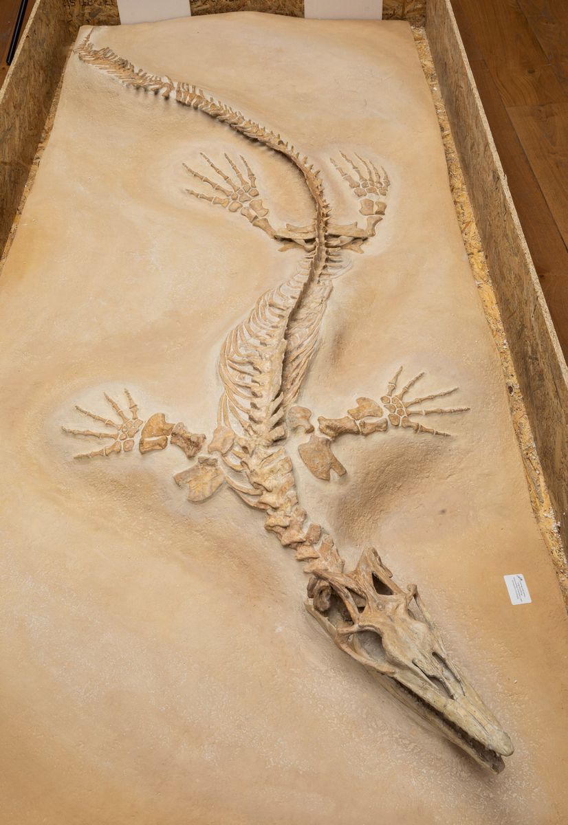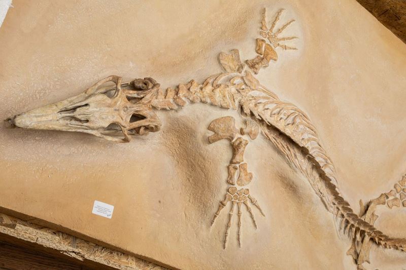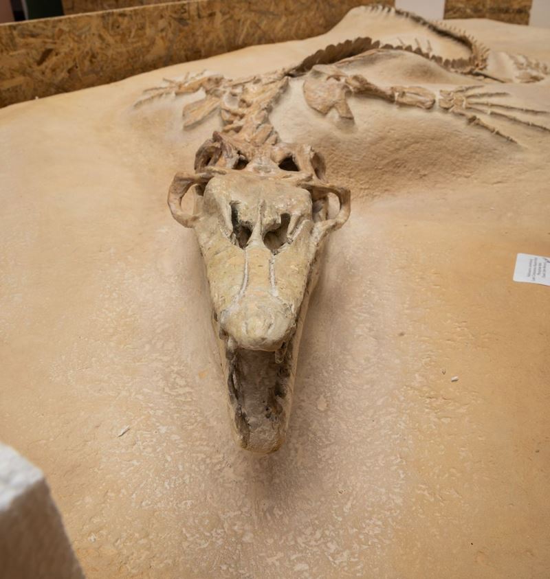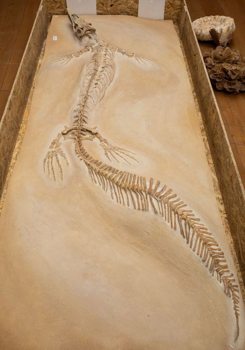 Bella preparazione su lastra per questo esemplare di mosasauro, feroce predatore marino dell'epoca d'oro dei dinosauri
