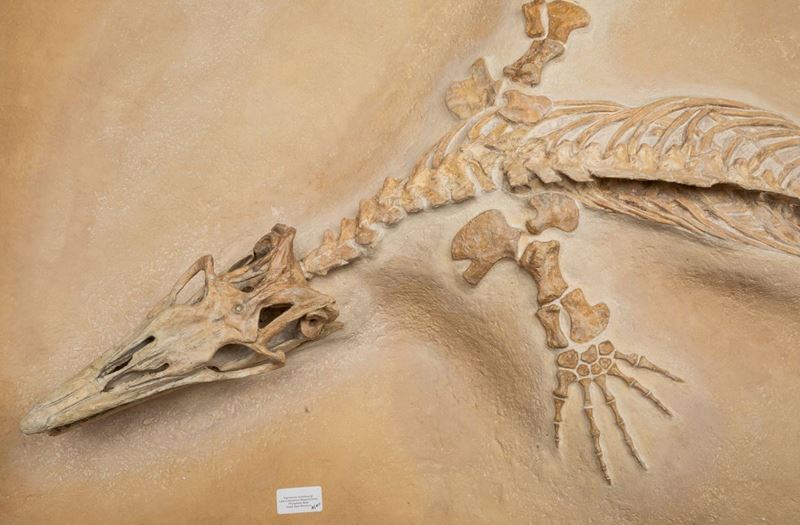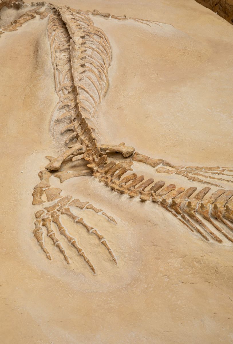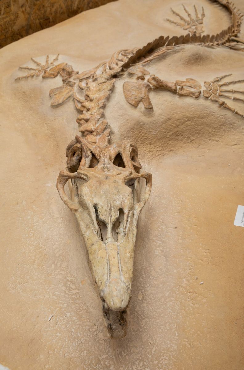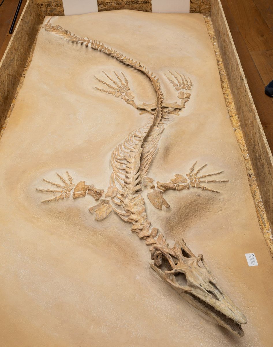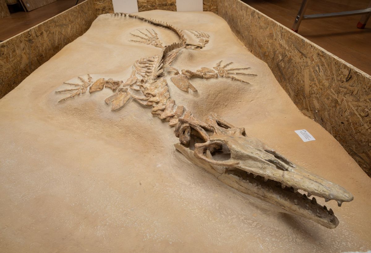 Bella preparazione su lastra per questo esemplare di mosasauro, feroce predatore marino dell'epoca d'oro dei dinosauri