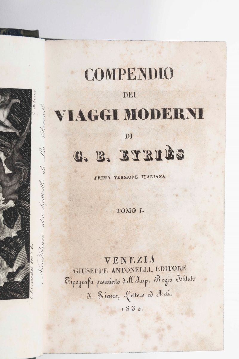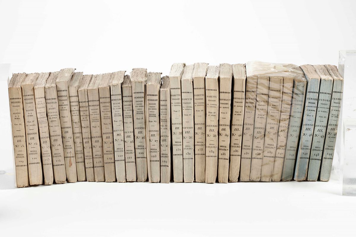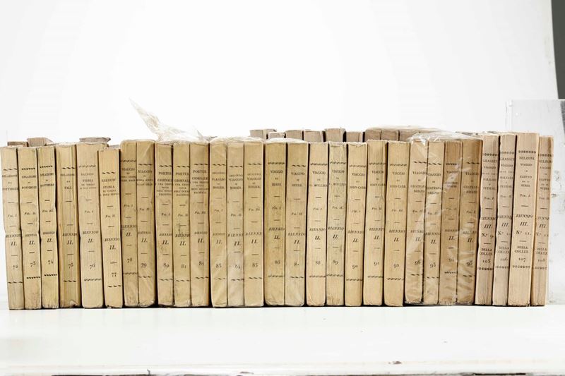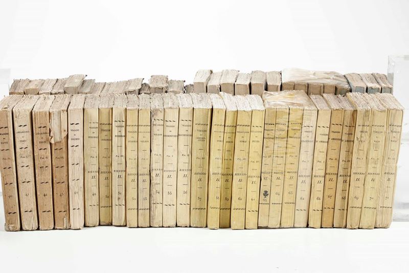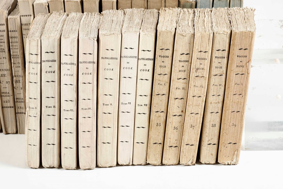 Collezione dei Viaggi Sonzogno, 93 tomi, pubblicati a Milano nella prima metà del secolo XIX. Purtroppo scompleti di tutte le tavole incise. Nel lotto si aggiunge: Eyres 21 volumi e altri 14 volumi che riguardano tematiche affini.