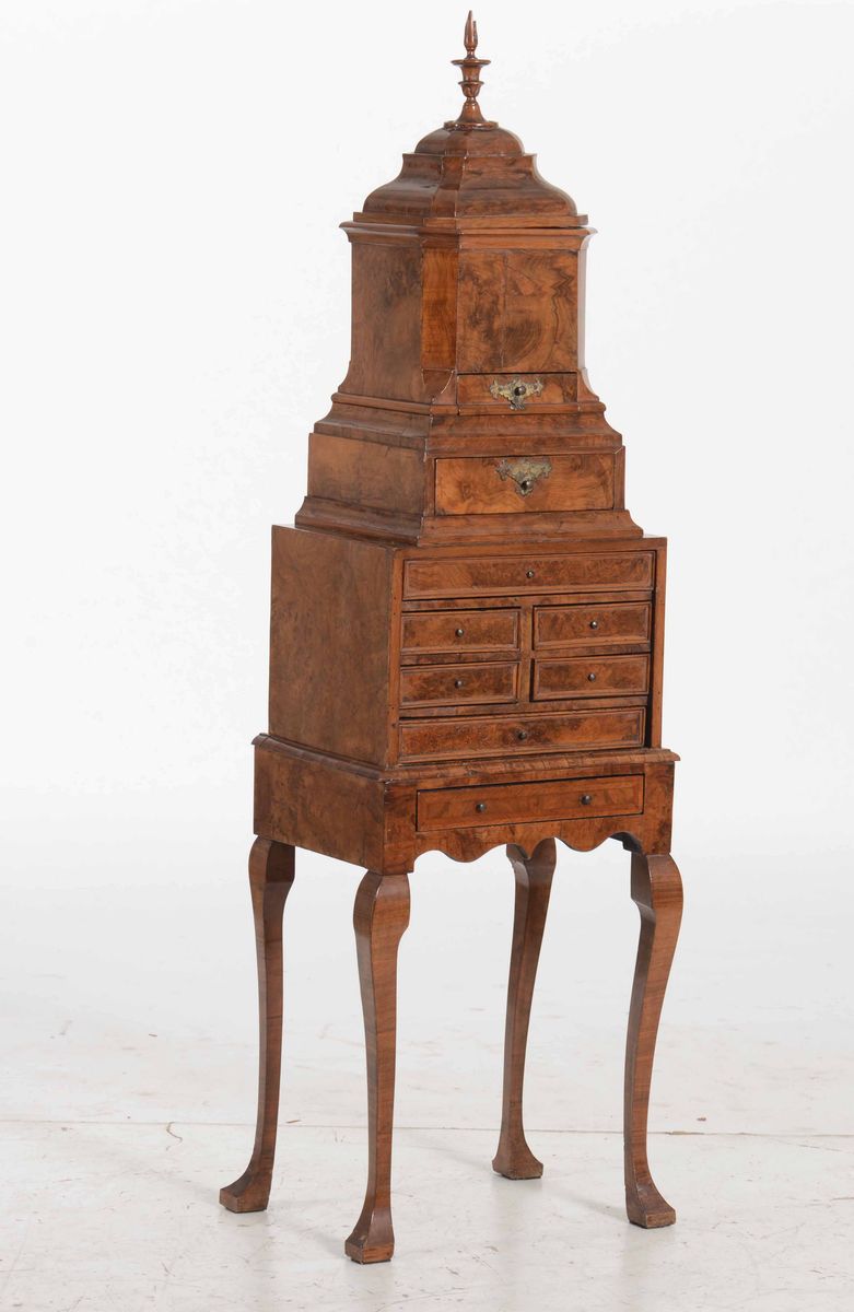 Mobile a due corpi in legno lastronato in radica, XIX secolo