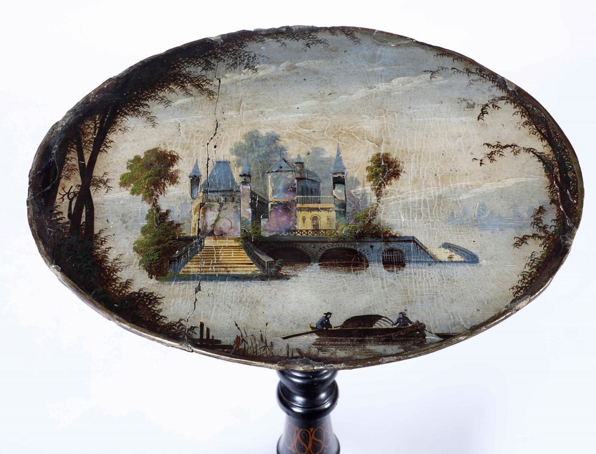 Piccolo tavolino in legno ebanizzato e dipinto, XX secolo