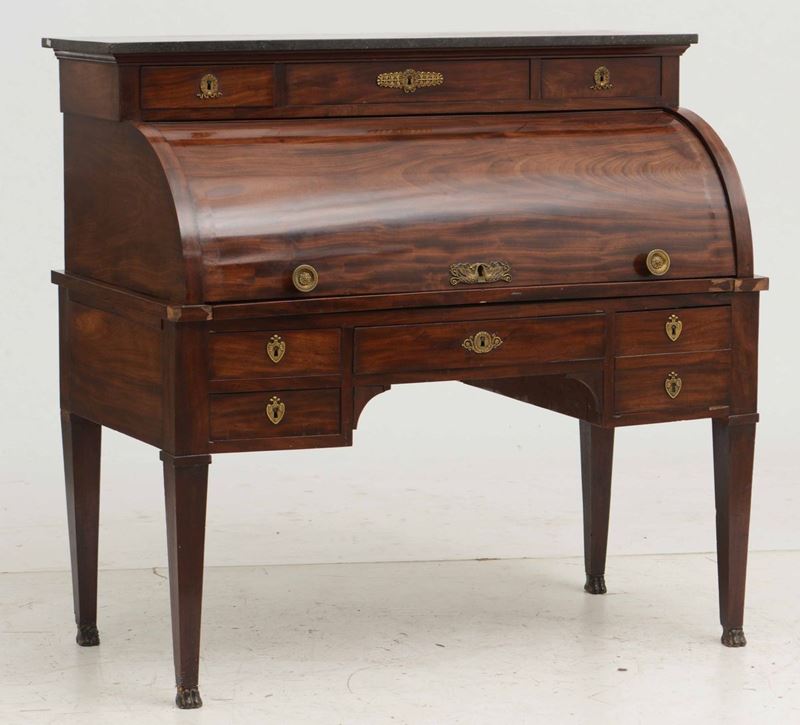 due cassetti laterali ed uno centrale, alzata superiore con tre cassettini, scrittoio con piano in pelle cm 128x68x125
