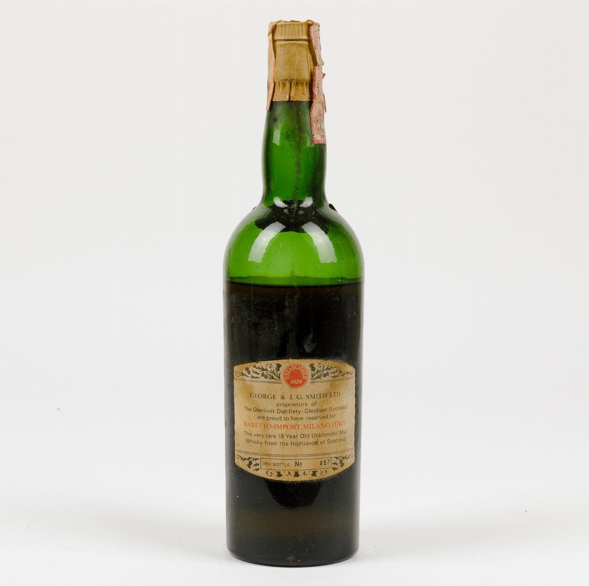 (etichetta e capsula con segni d'usura del tempo) importato da Baretto Milano imbottigliato da George & J.G. Smith LTD. bottiglia n. 487