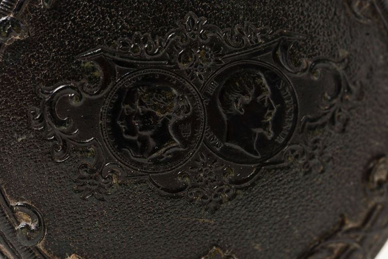 Bicchiere telescopico da viaggio in metallo entro scatola in cuoio impresso con effige di Napoleone III. Manifattura del [..]