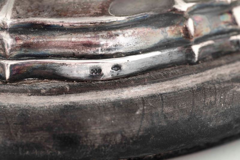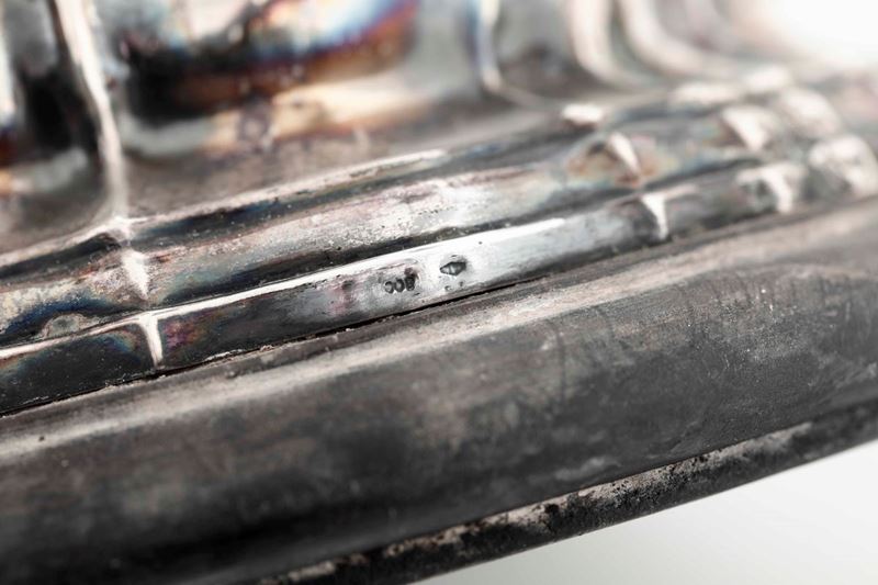 Coppia di candelabri a cinque luci in argento e base in legno ebanizzato. Argenteria italiana. Marchio con fascio littorio [..]