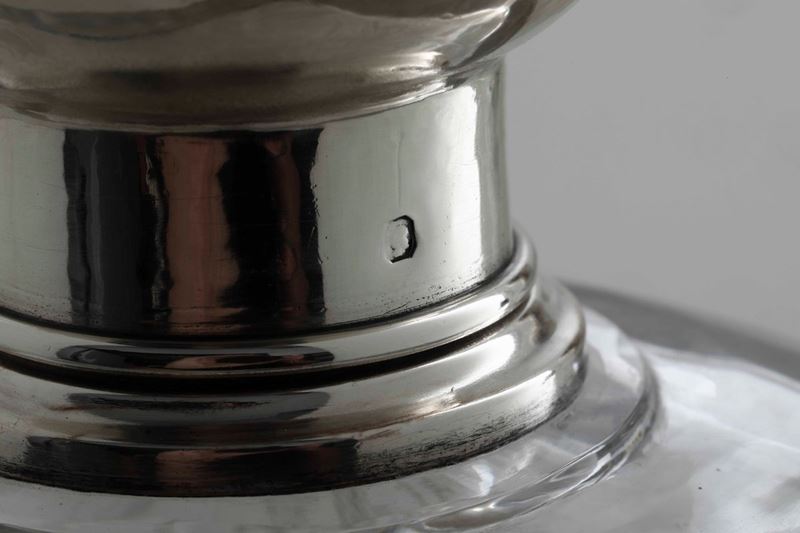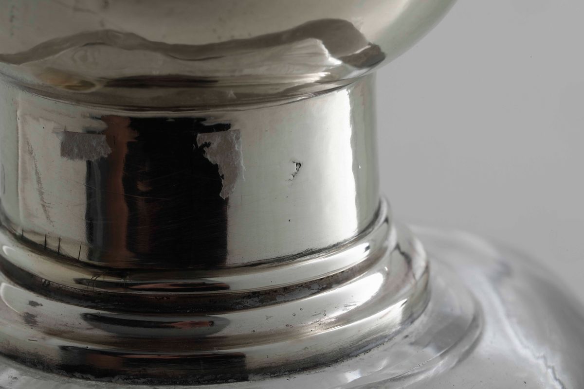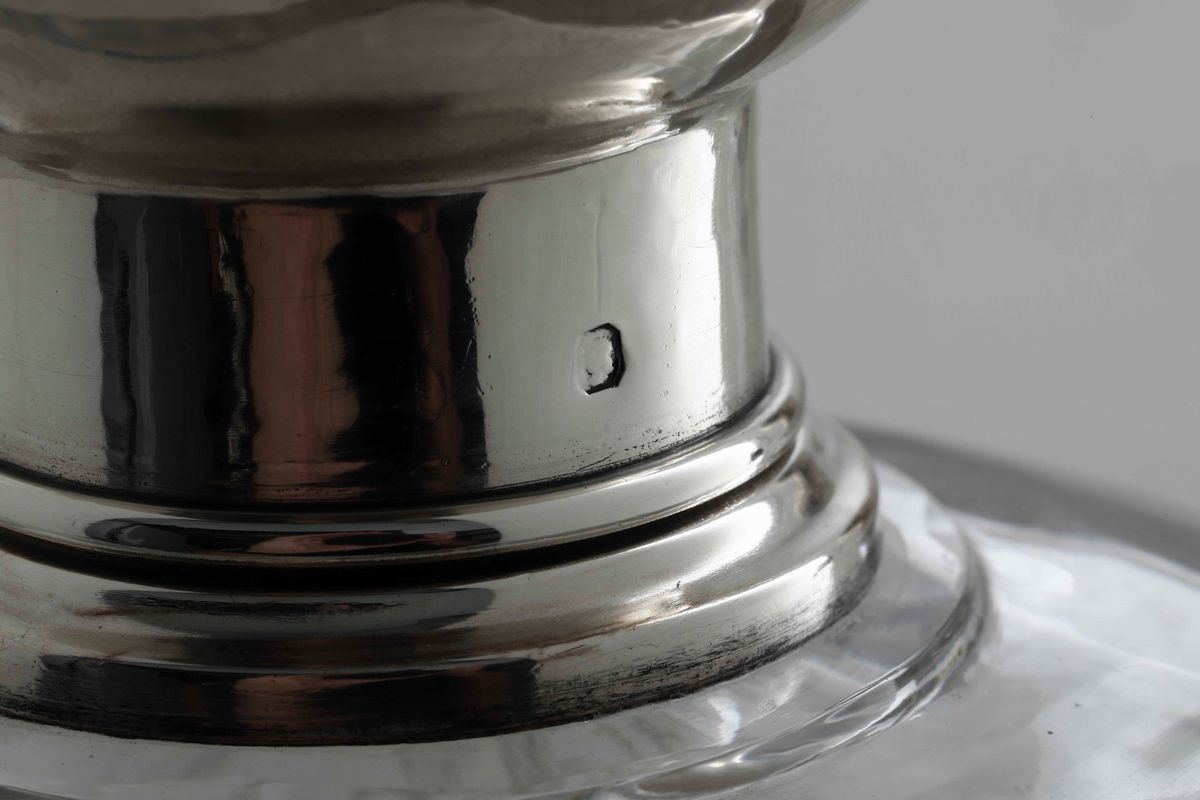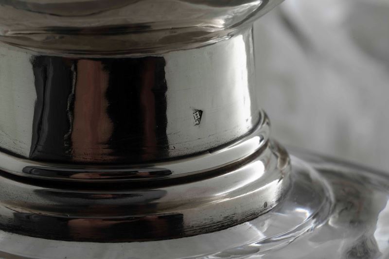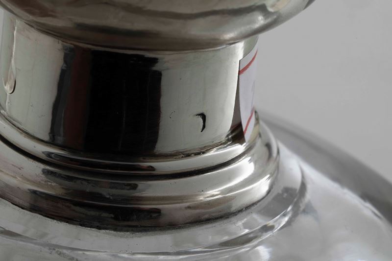 Due bottiglie in cristallo molato con tappo in argento cesellato. Francia XIX-XX secolo