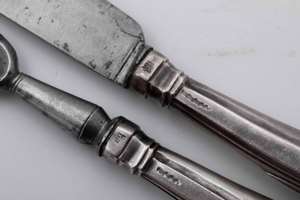 Gruppo di tre coppie di posate composte da forchettone e coltello da arrosto in argento, di cui due Genova inizi XIX secolo uno senza bolli apparenti
