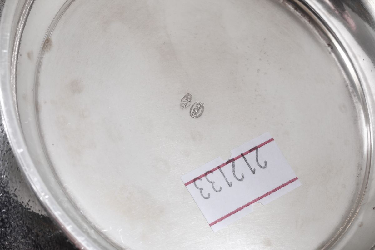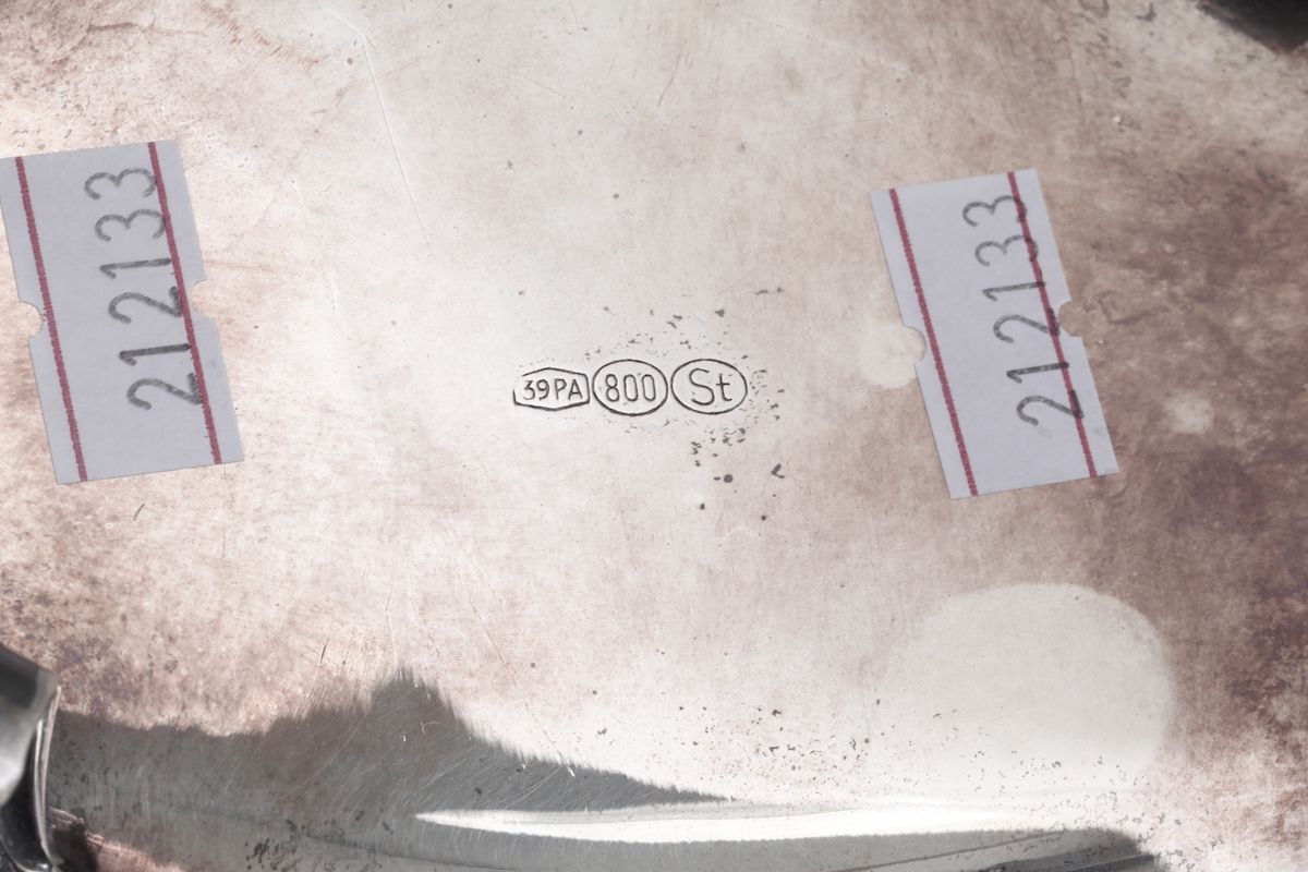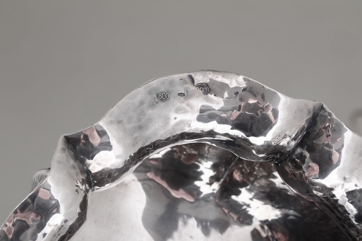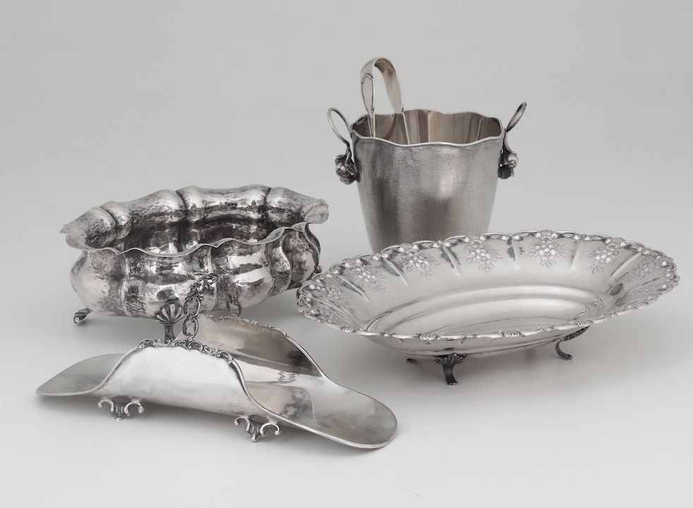 Insieme di due centrotavola, portagrissini e secchiello in argento. Argenteria italiana del XX secolo
