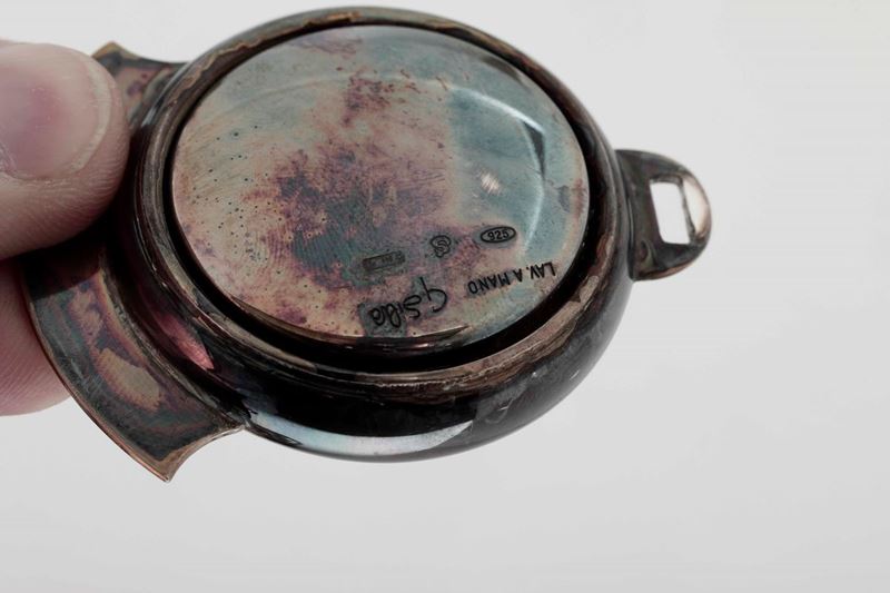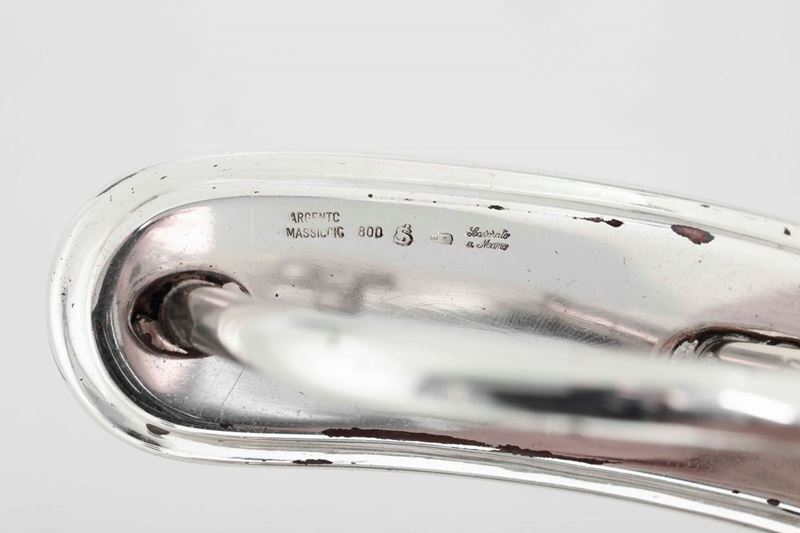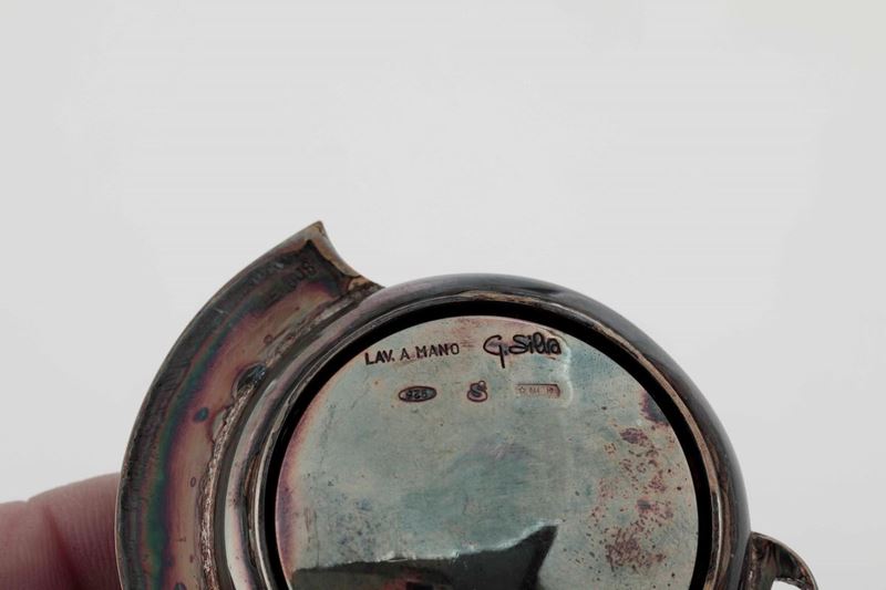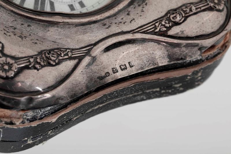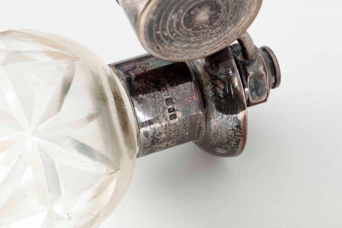 Insieme di orologi in argento e due boccette in argento e vetro. Coppia orologi argentiere Silva, Milano XX secolo. Orologio da tavolo. Birmingham 1938. Due boccette, Inghilterra (?) XX secolo
