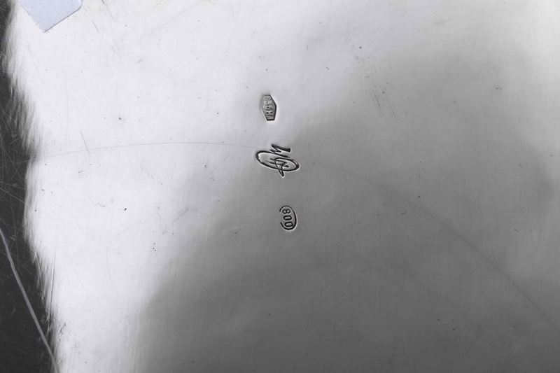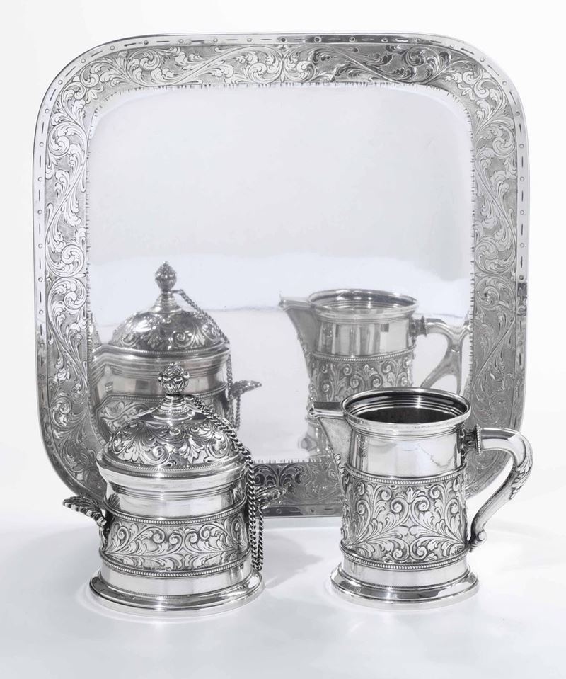 Lotto composto da vassoio quadrato, zzuccheriera e lattiera. Argenteria milanese del XX secolo