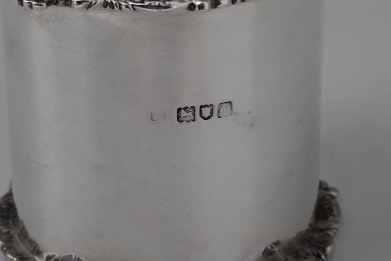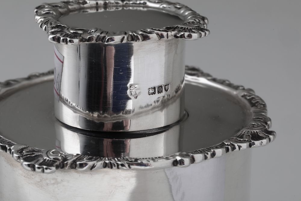 Piccolo tea caddy cilindrico in argento. Londra XIX-XX secolo