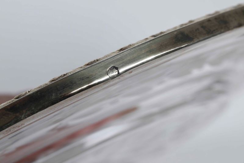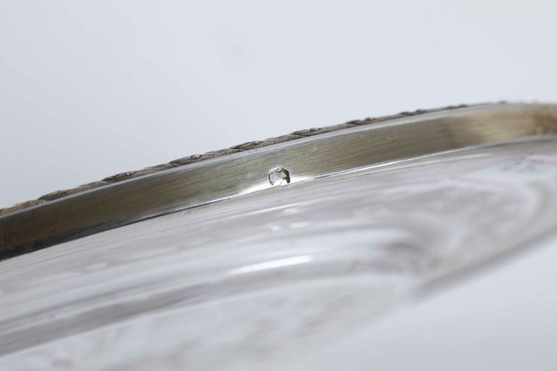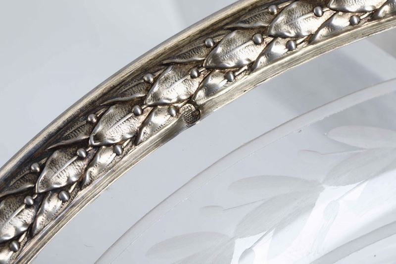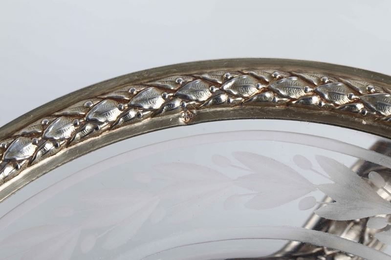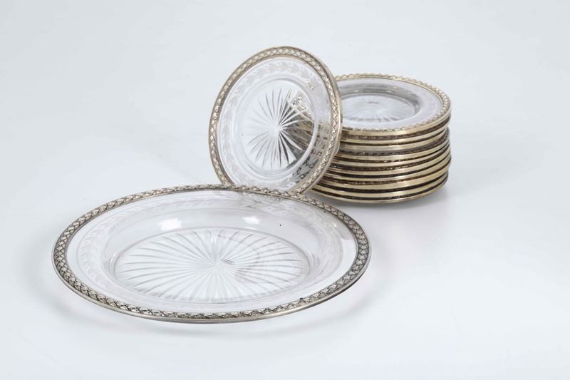 Un piatto e undici piattini in vetro molato con bordo in argento primo titolo. Francia XX secolo