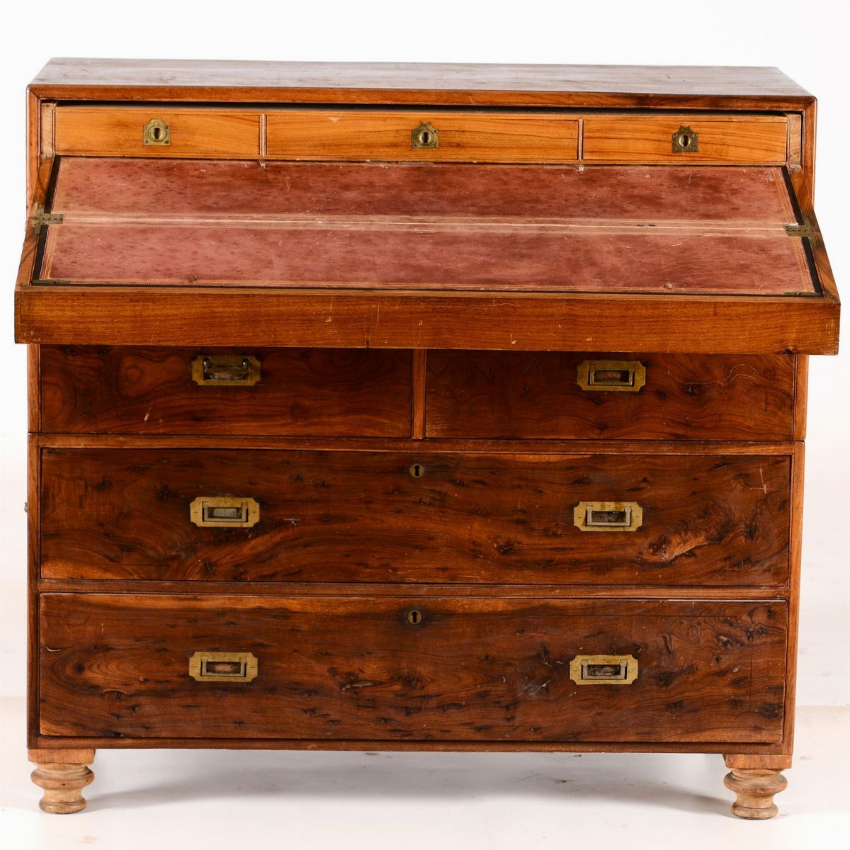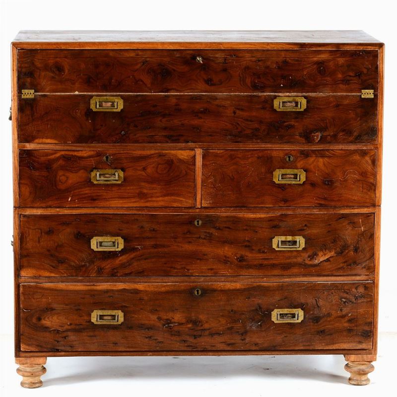 a due corpi e cinque cassetti, cassetto superiore apribile a formare scrittoio con tre cassettini
