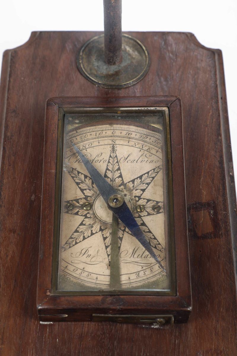Una semisfera con scala incisa è montata su un supporto regolabile, fissato su base in legno con bussola