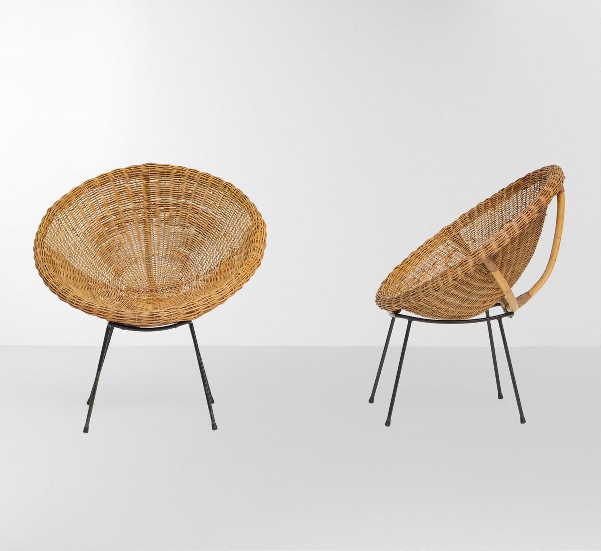 Due poltroncine con sostegni in metallo e seduta in rattan.