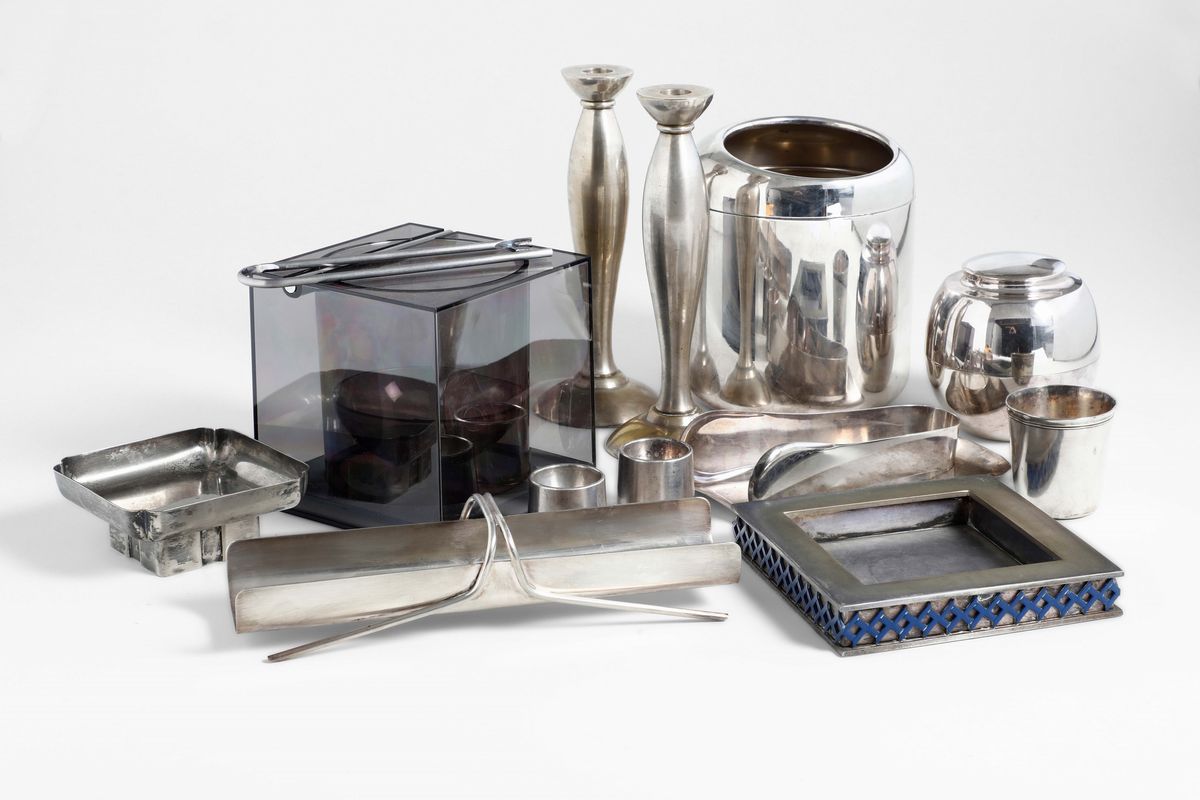 Lotto composto da una coppia candelieri, uno svuotatasche, uno svuotatasche Munari GFT, un Portaghiaccio Cini e Nils, una vaschetta per asparagi con pinza, un portabottiglie, una scatola Sabattini, un portagrissini Christofle, un bicchiere Christofle e due portauovo Krupp.