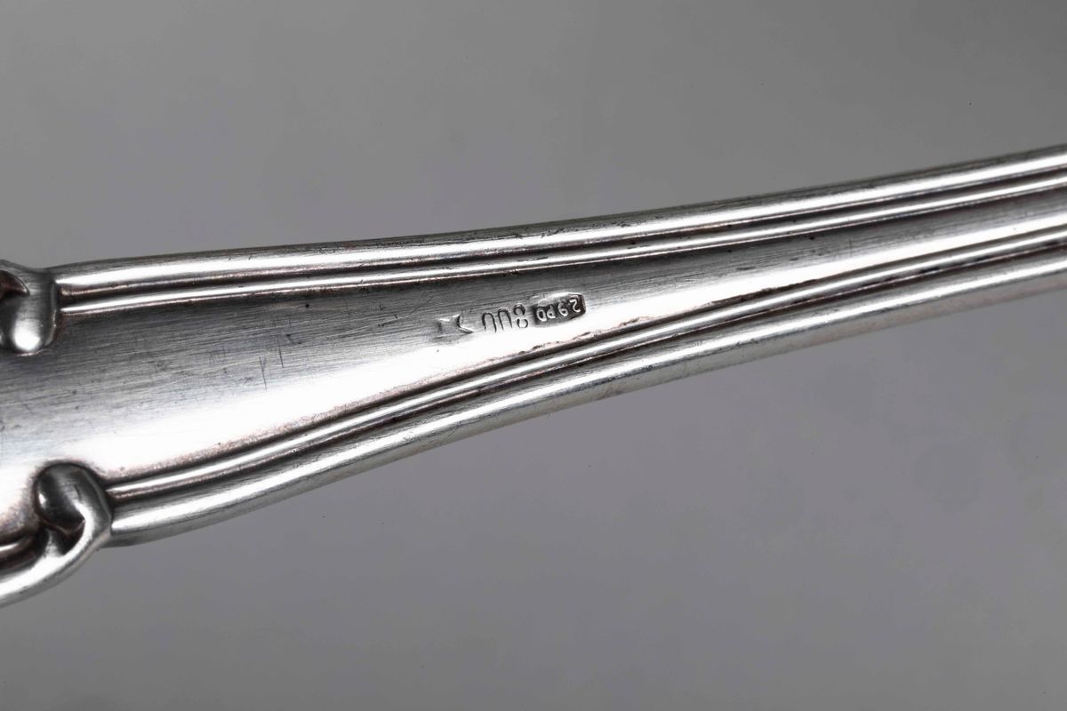 lotto composto da portapillole circolare, sei cucchiaini in argento e smalti, sei coltelli e due posate da dolce e da insalata. Argenteria italiana del XX secolo