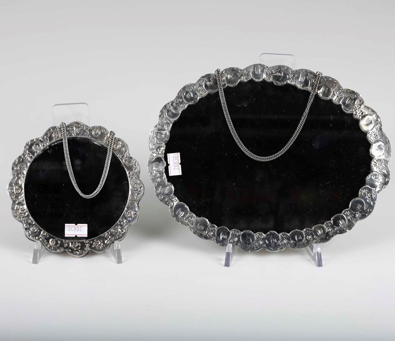 Lotto di due di specchi rivestiti in argento fuso e cesellato. Turchia o India XX secolo