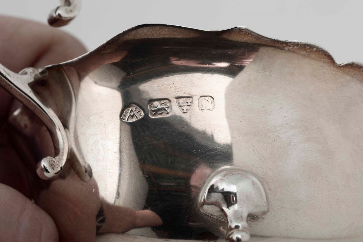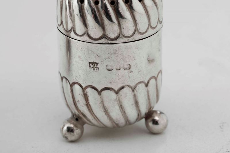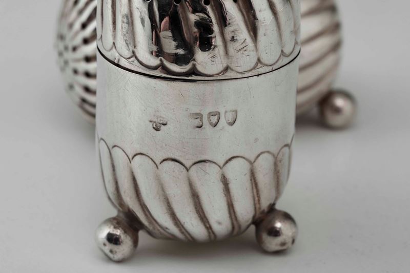 Salsiera e coppia di saliere in argento. Inghilterra XX secolo