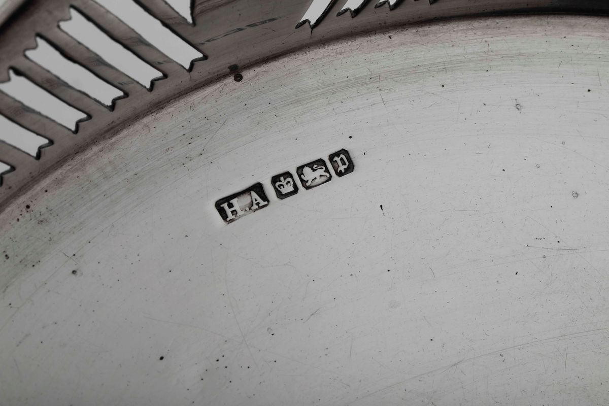 Vassoio rotondo in argento fuso, traforato e cesellato. Inghilterra XX secolo. Marchio della città di Sheffield per l'anno 1907