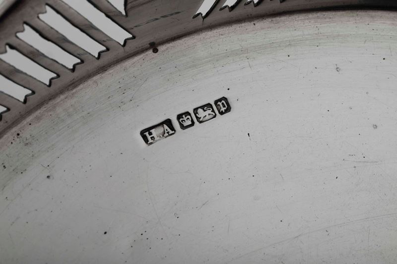 Vassoio rotondo in argento fuso, traforato e cesellato. Inghilterra XX secolo. Marchio della città di Sheffield per l'anno [..]