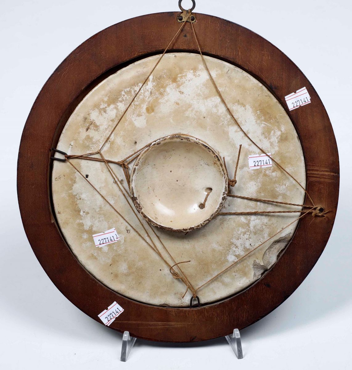 Maiolica policroma a gran fuoco montata in cornice in legno. Diametro massimo cm 29,8. Conservazione: sbeccatura sul retro